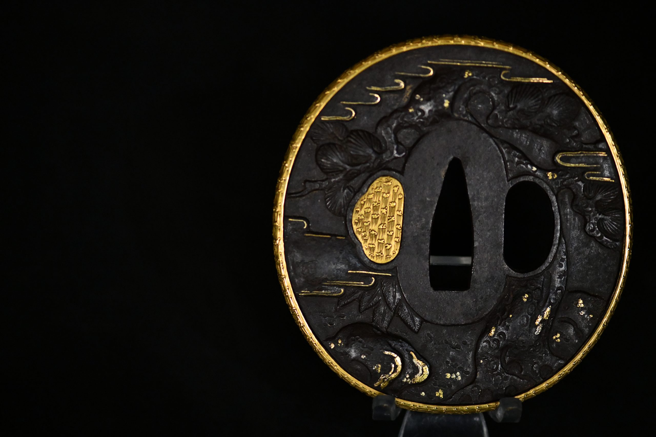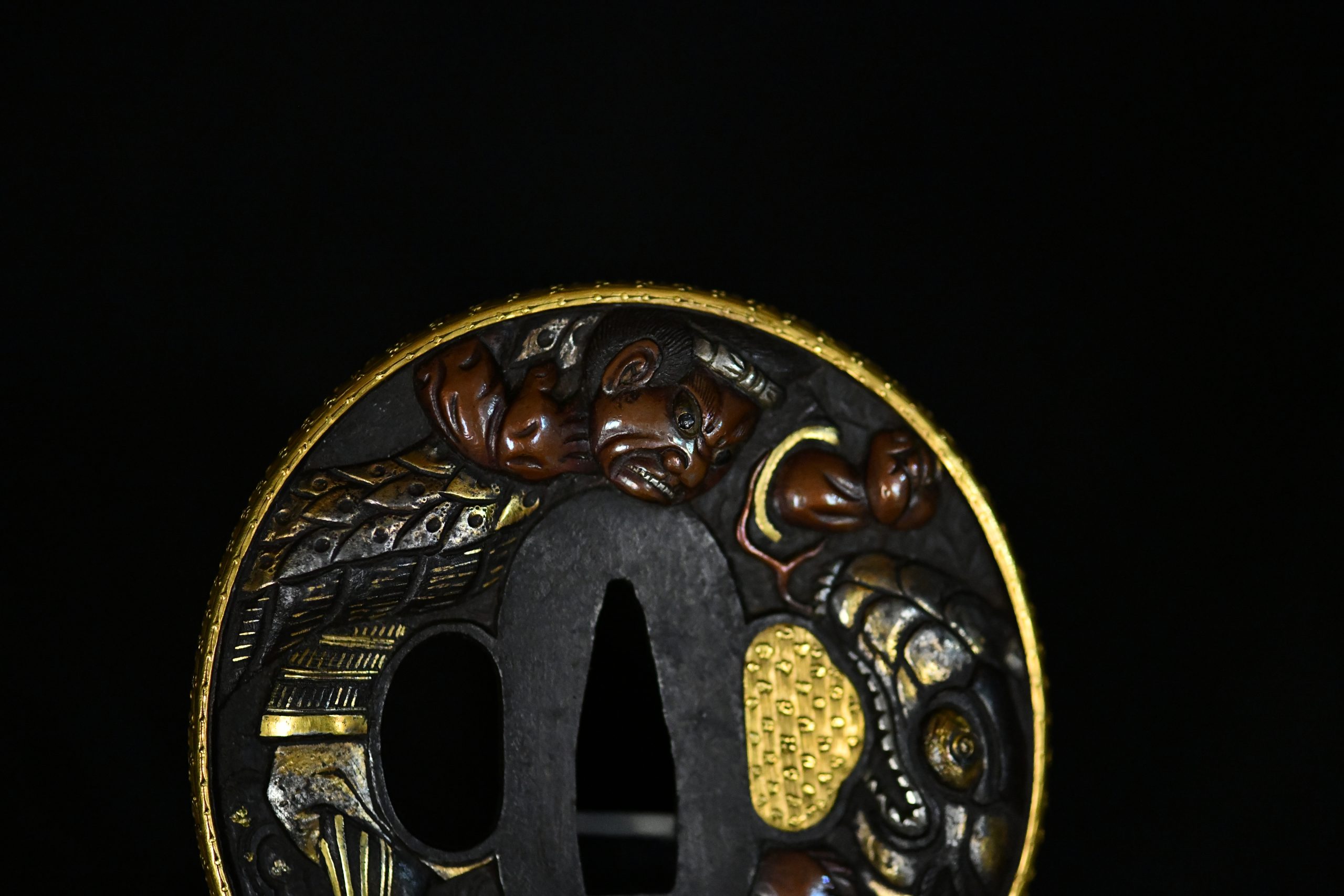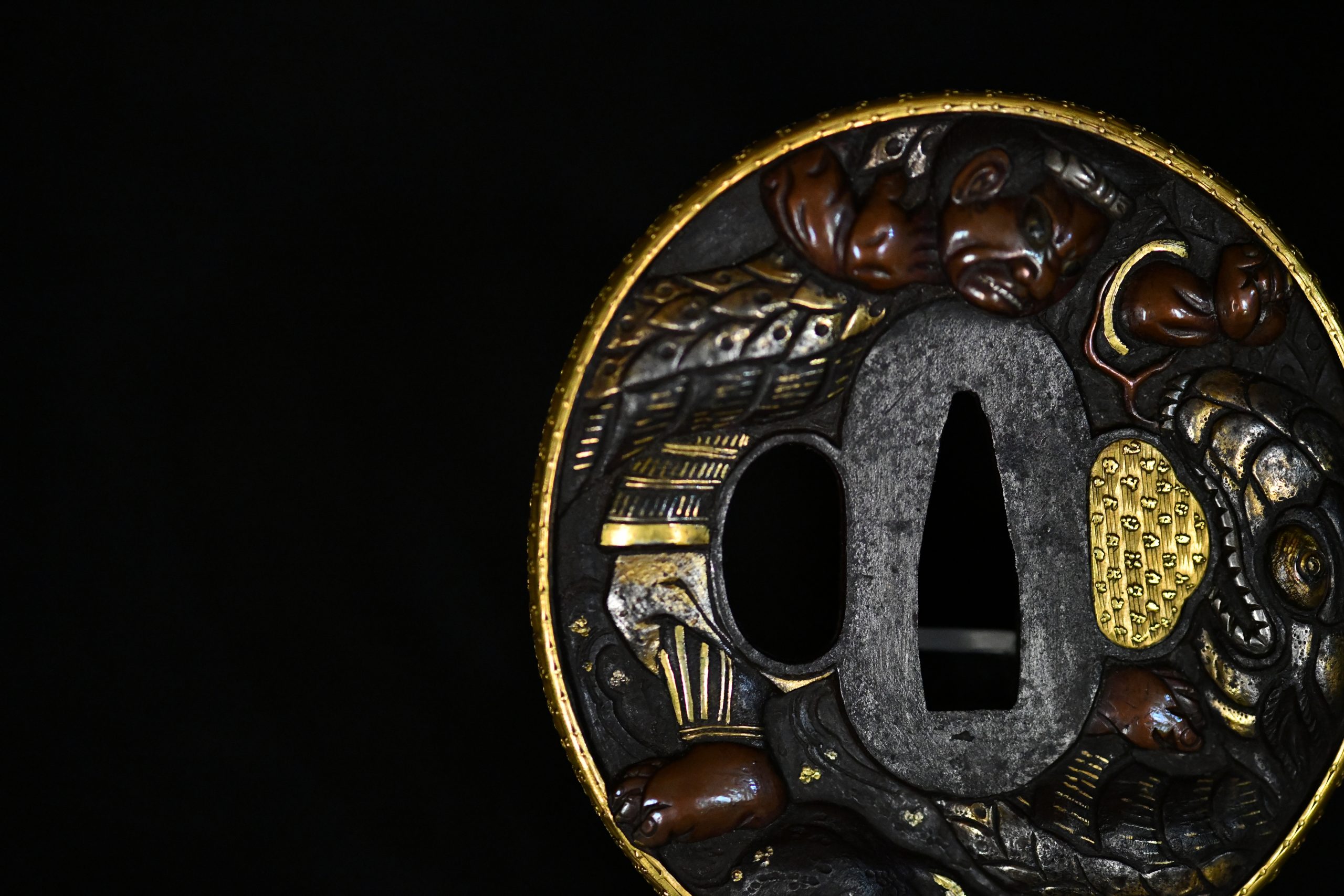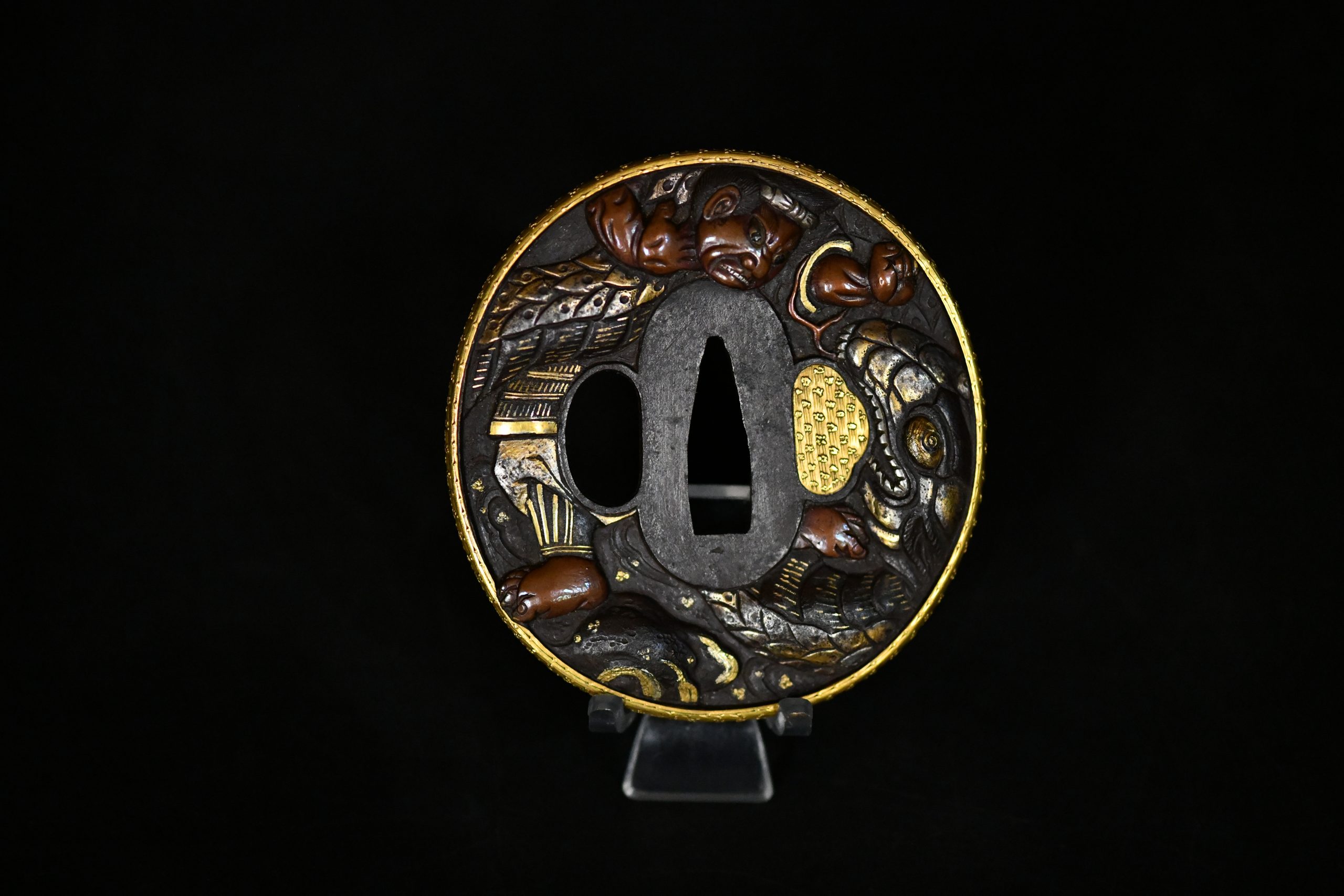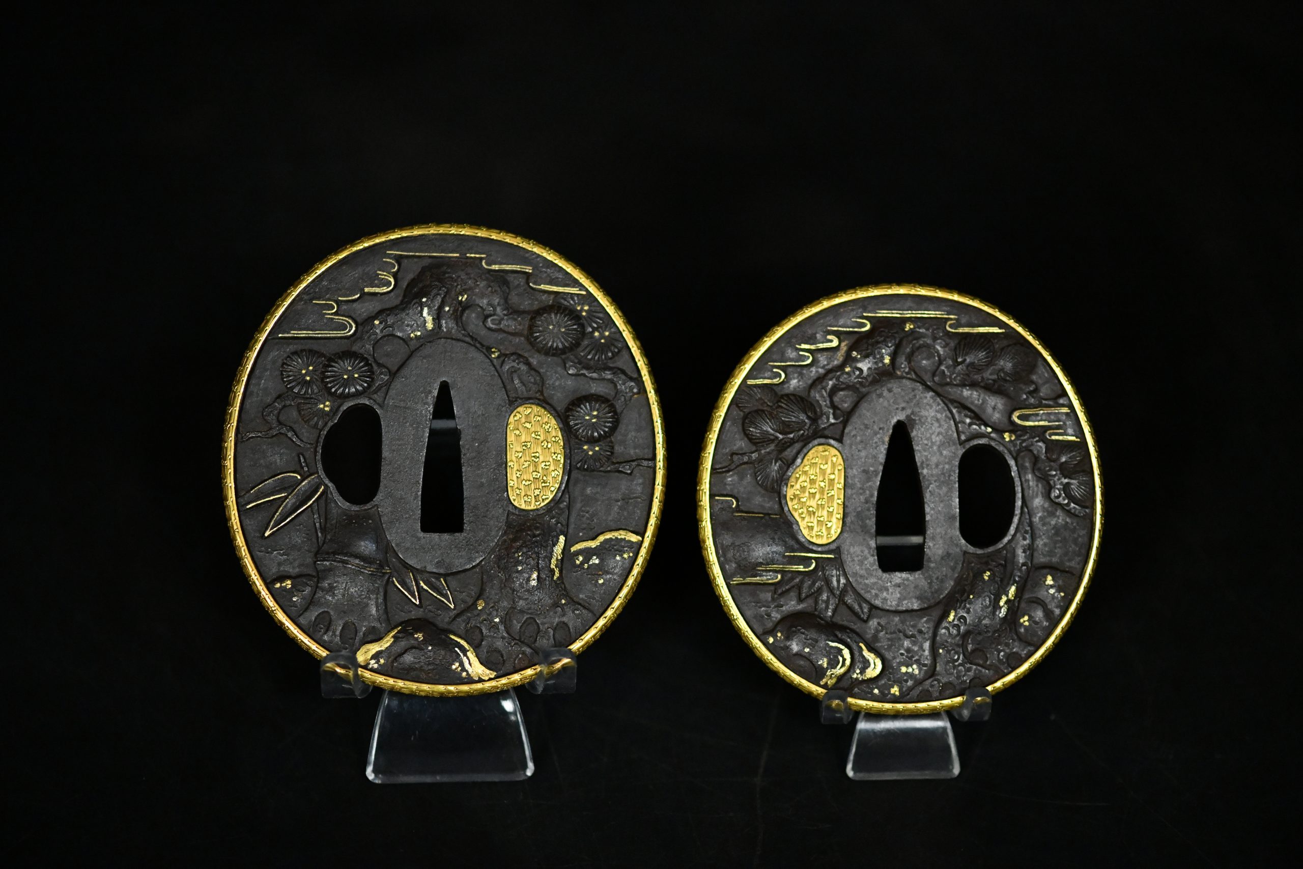 An exceptionally refined matched daishō tsuba set of outstanding artistic and technical quality. These guards display masterful high-relief carving on a dense iron plate, richly accented with gold and silver-plated inlays and a finely finished gilt rim. The workmanship demonstrates the hand of a highly accomplished metal artist working in the Edo period aesthetic tradition, with sculptural depth and narrative dynamism rarely encountered.