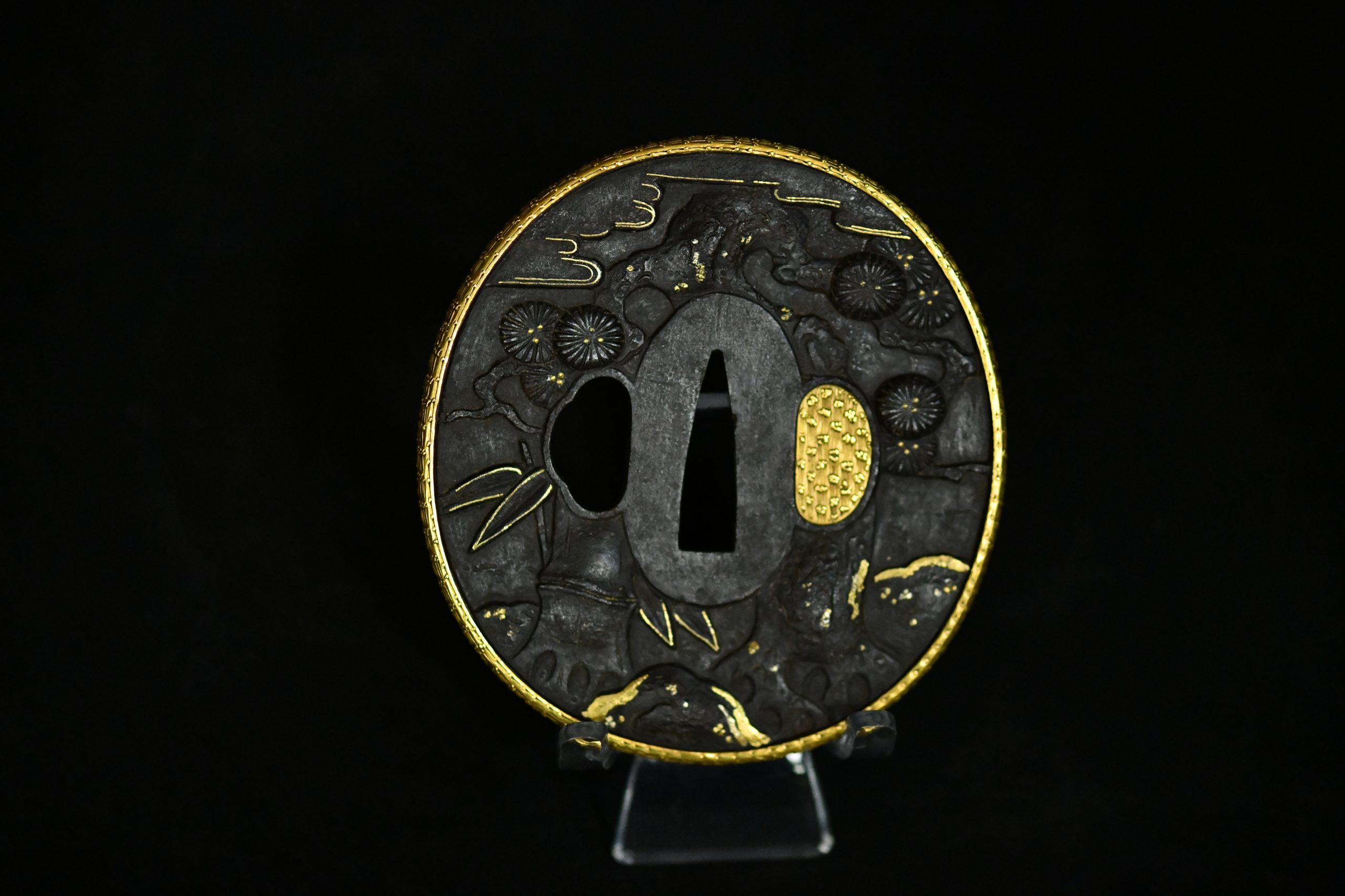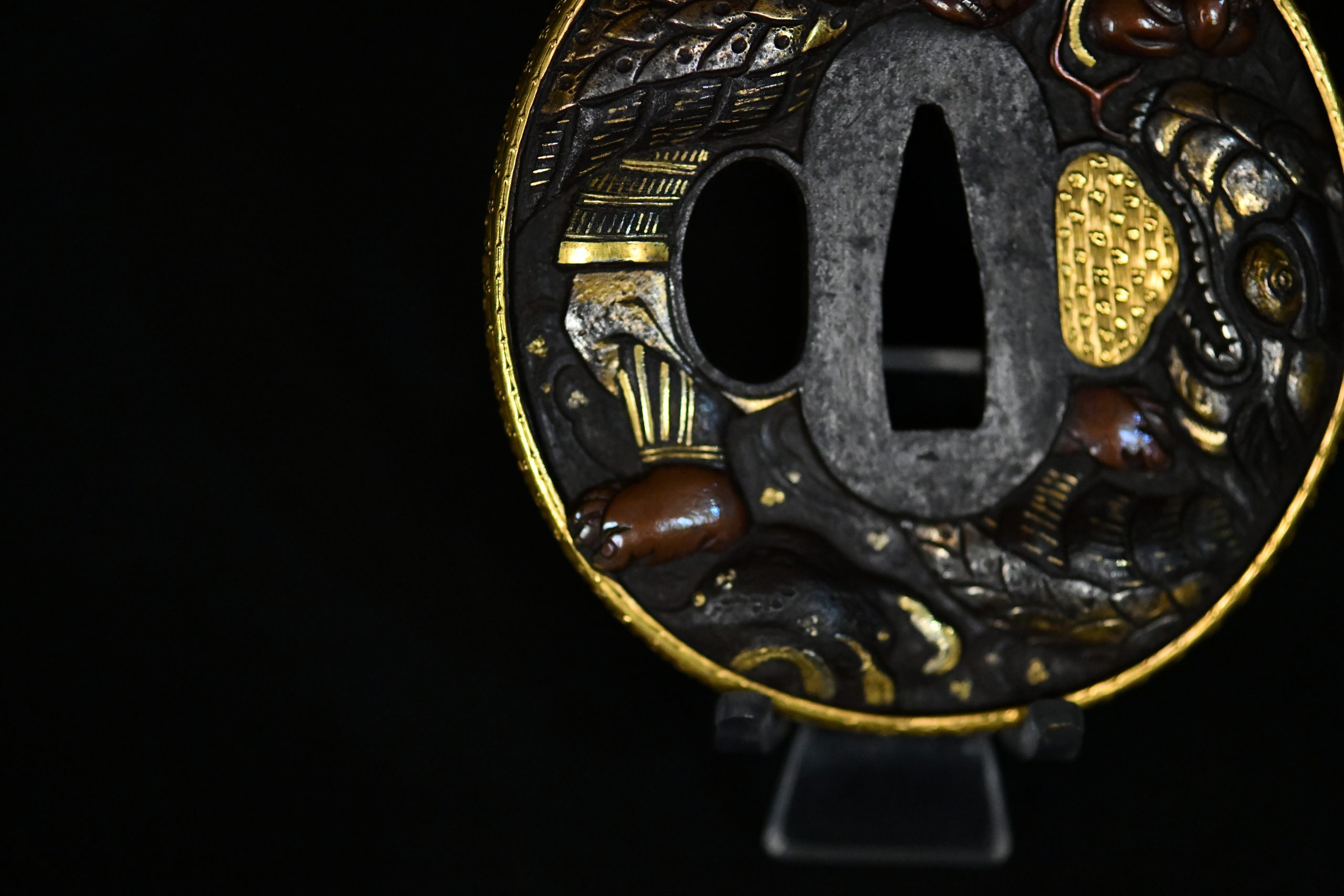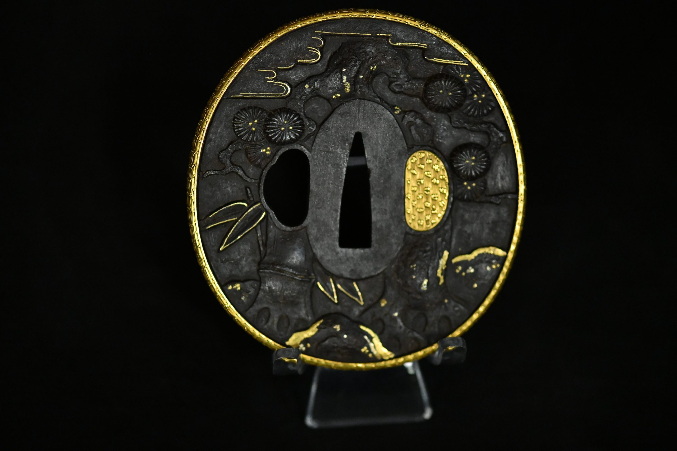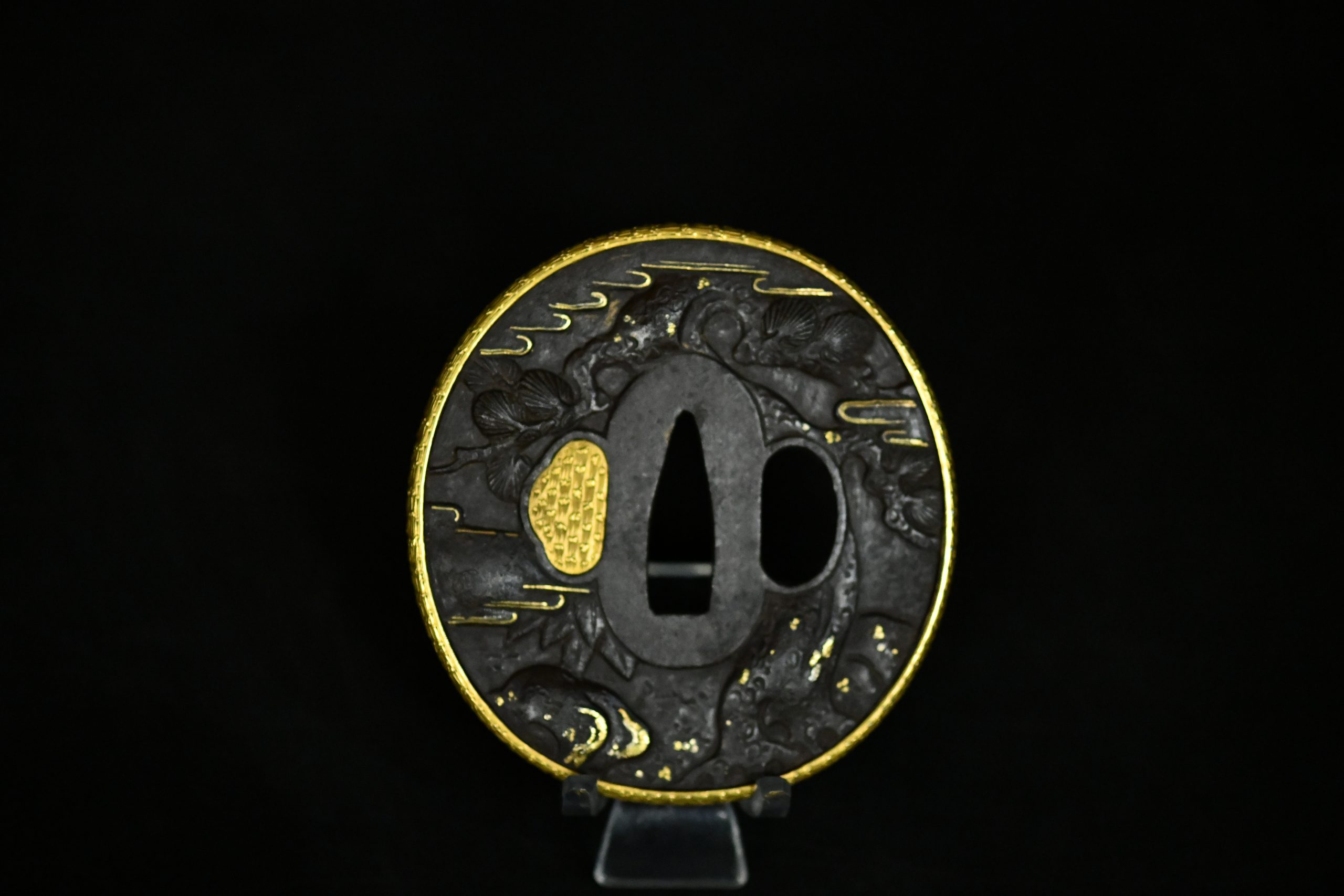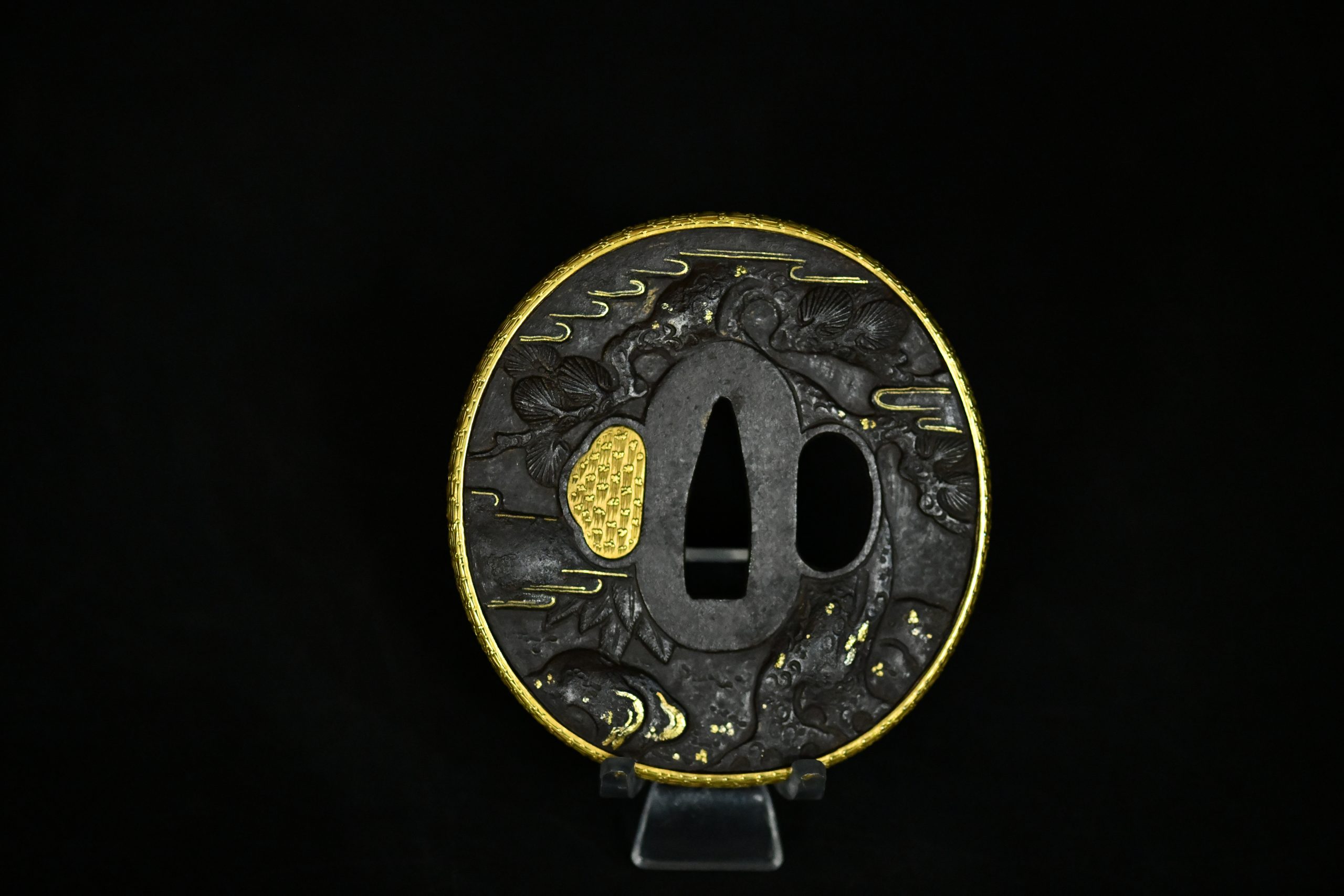An exceptionally refined matched daishō tsuba set of outstanding artistic and technical quality. These guards display masterful high-relief carving on a dense iron plate, richly accented with gold and silver-plated inlays and a finely finished gilt rim. The workmanship demonstrates the hand of a highly accomplished metal artist working in the Edo period aesthetic tradition, with sculptural depth and narrative dynamism rarely encountered.