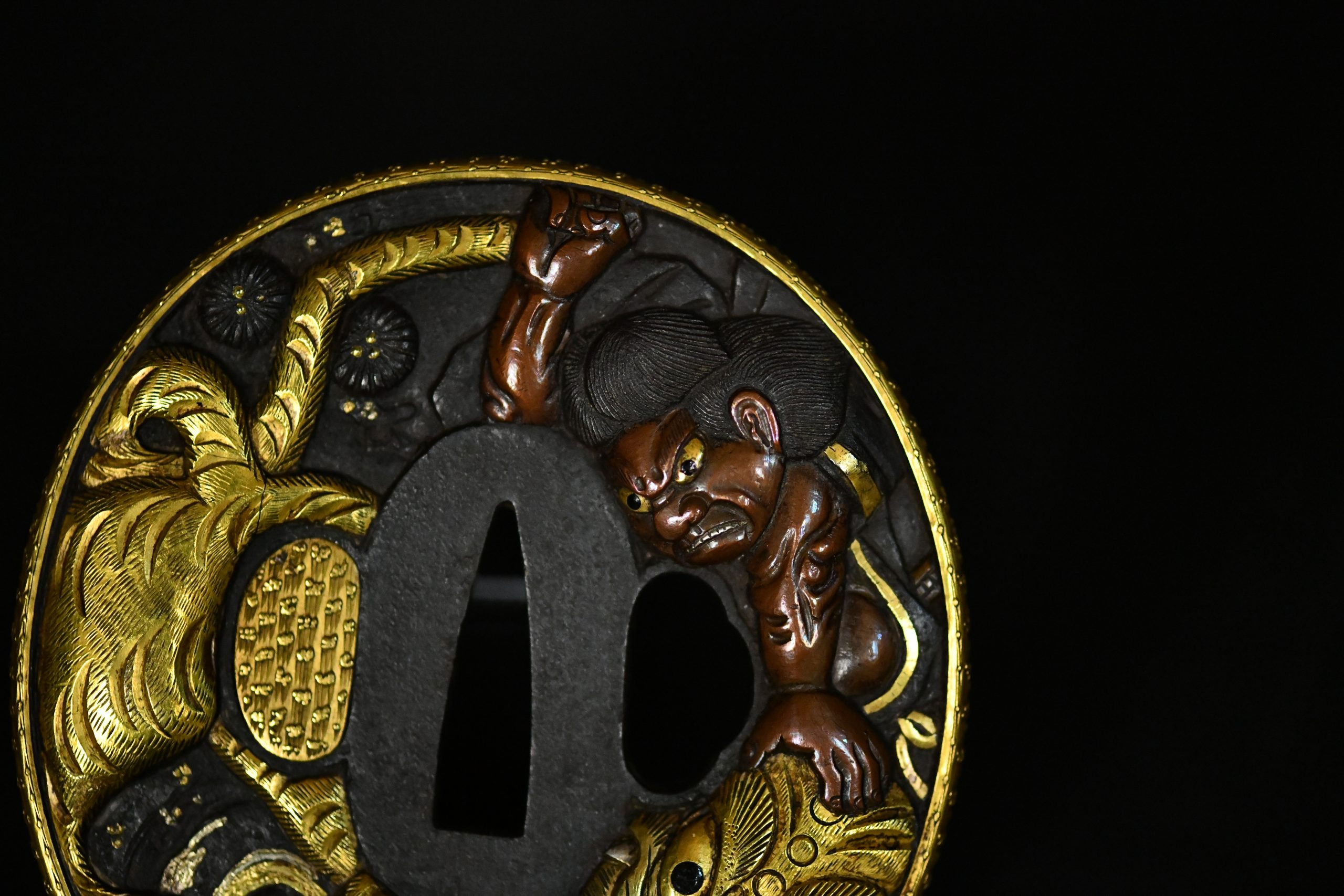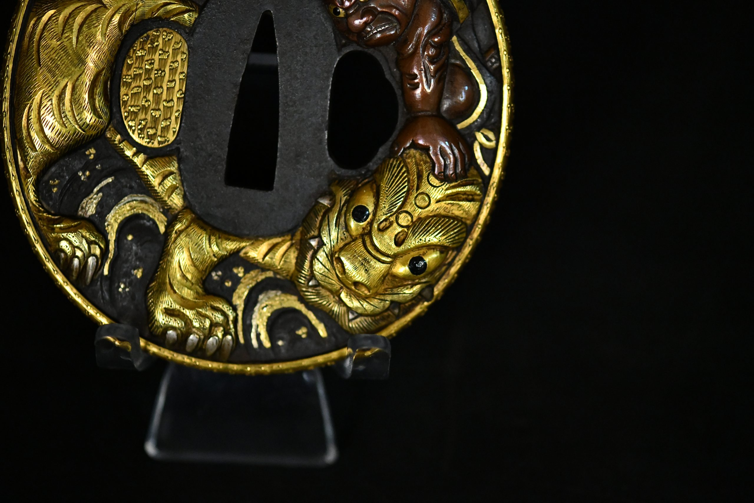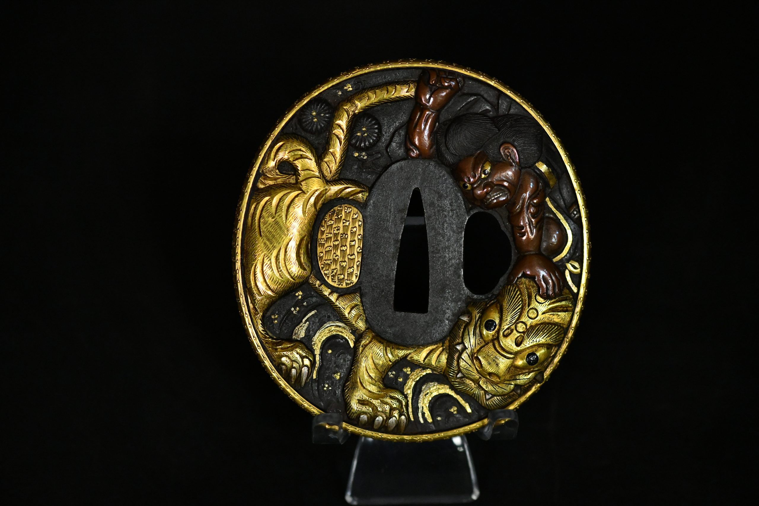 The omote of the larger tsuba presents a powerful mythological composition featuring a fierce oni grappling with a tiger rendered in deep relief, the surfaces meticulously worked to create strong volume and movement. The use of warm-toned metal for the figure contrasts elegantly with the dark iron ground, while the gold elements provide controlled highlights rather than excessive ornamentation. The companion wakizashi guard continues the theme with equally sophisticated carving and matched decorative vocabulary, confirming the set was conceived as a unified daishō.