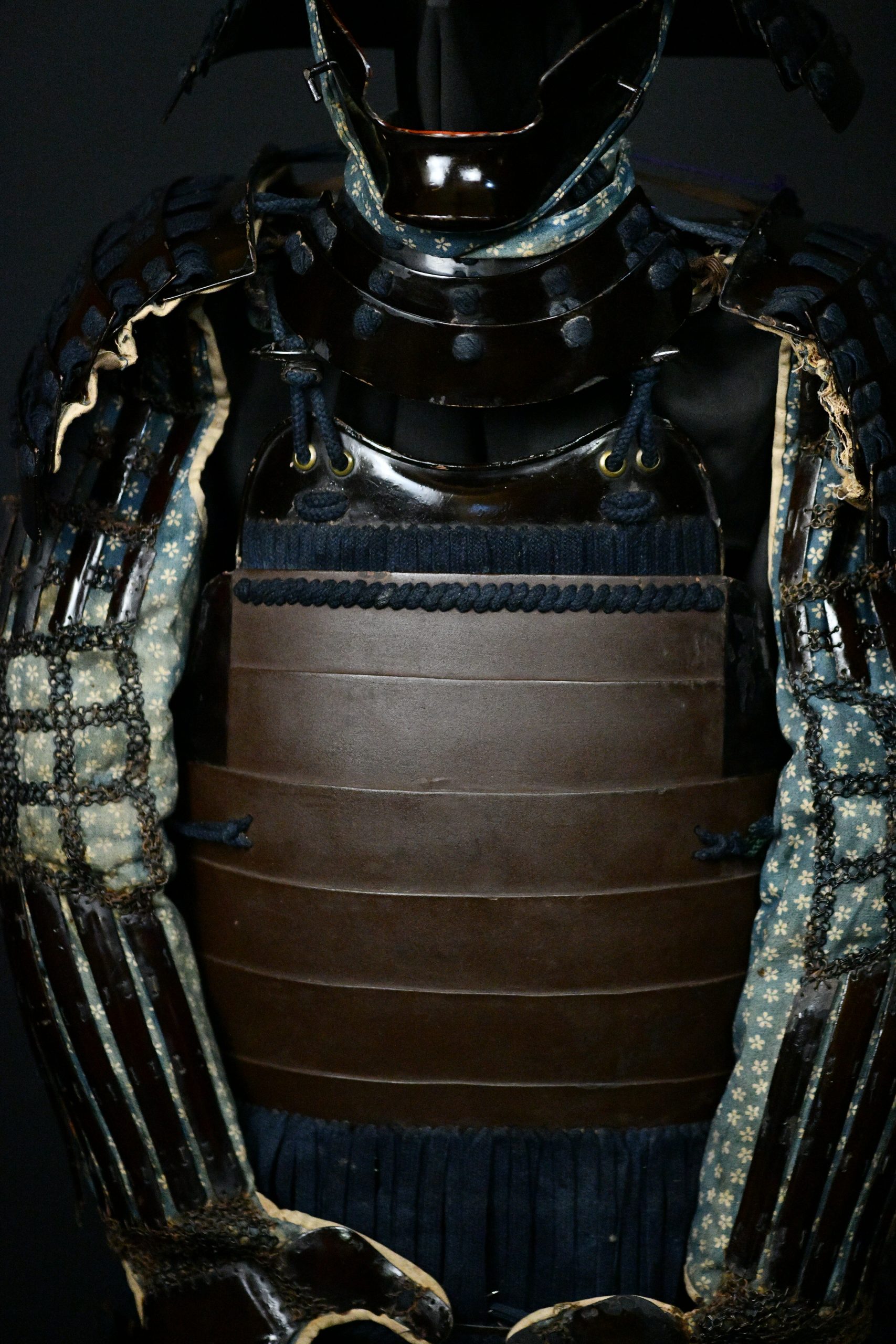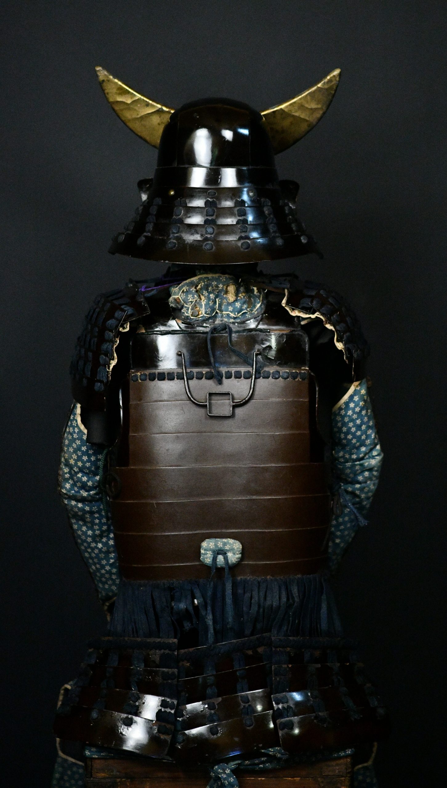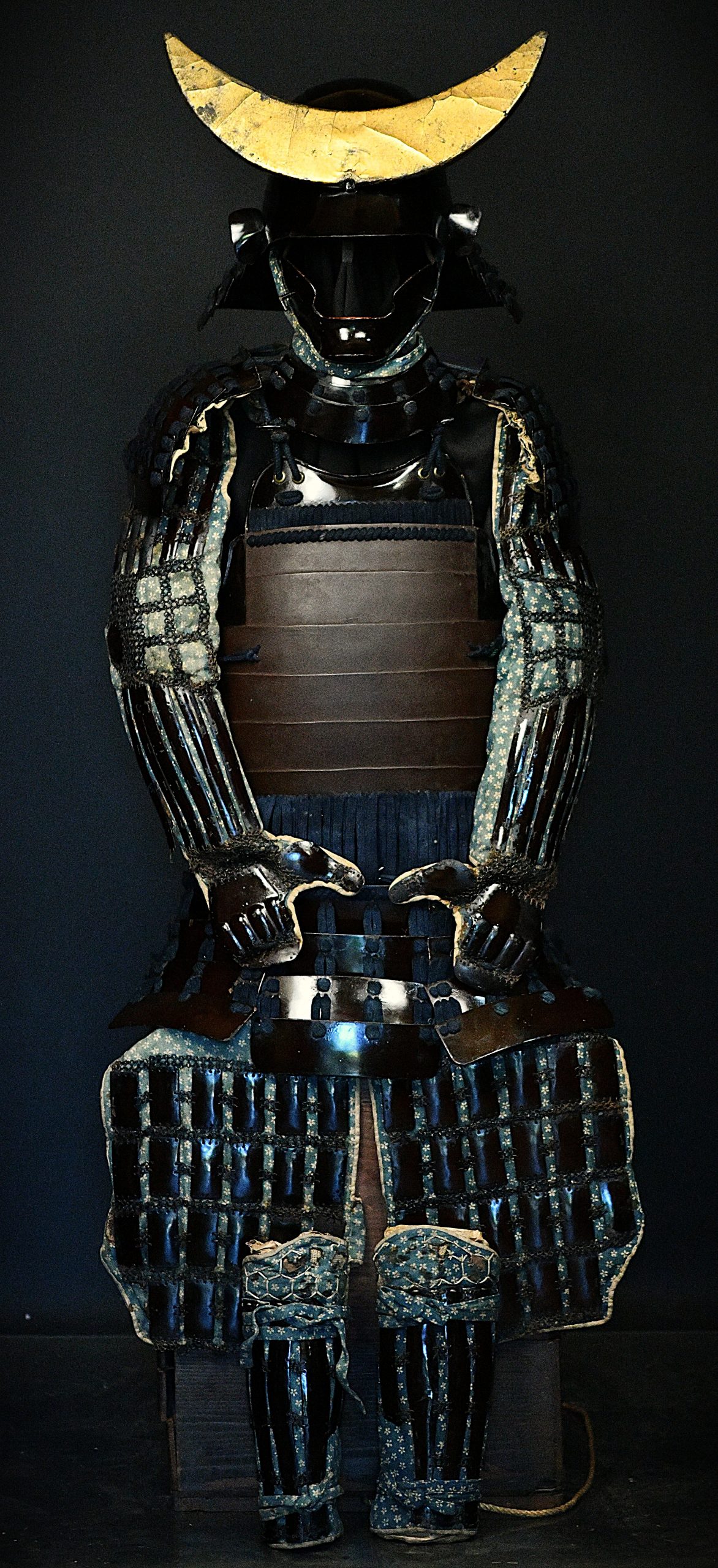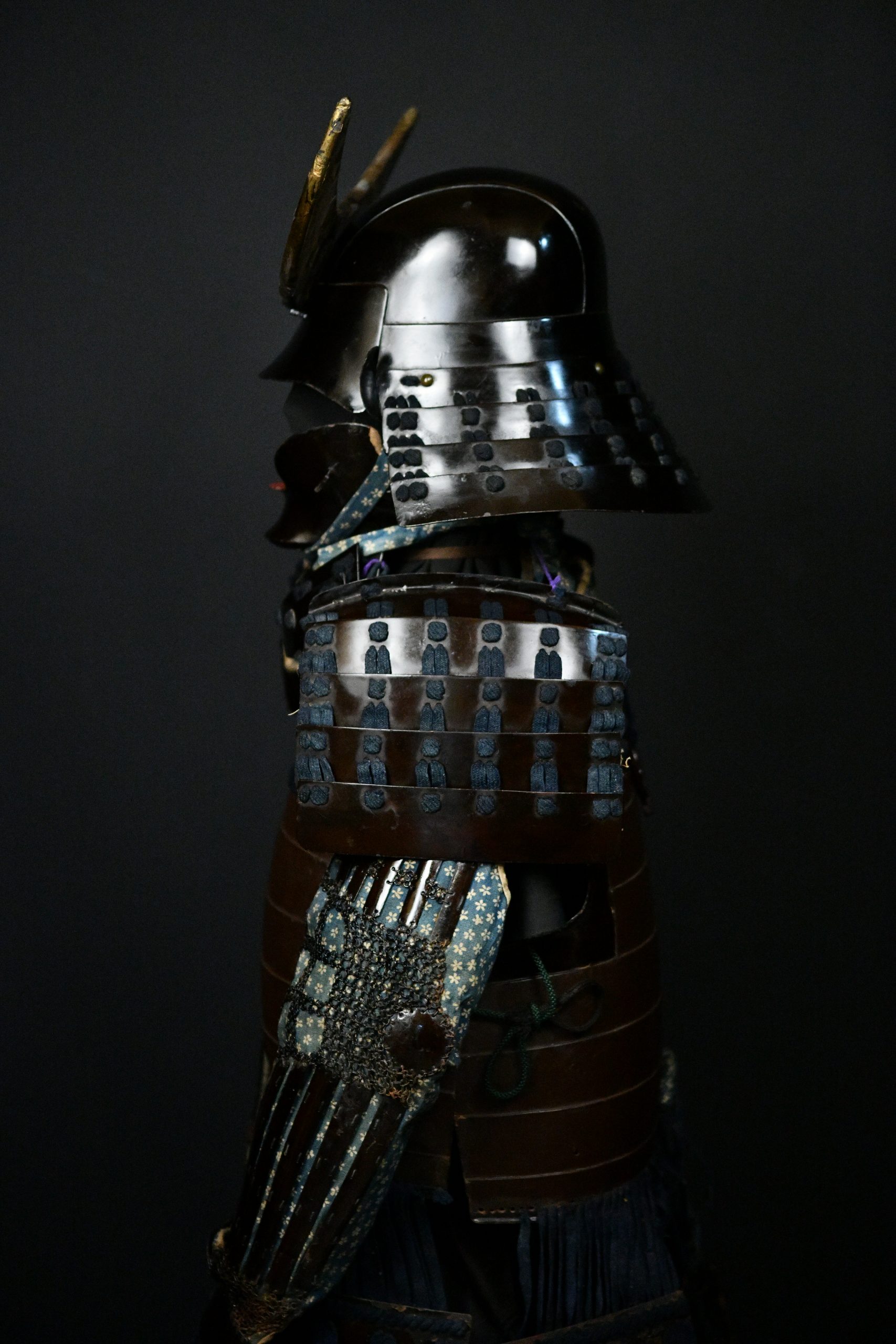 Cuirass (Dō): Yokohagi okegawa dō, lacquered black with indigo-blue lacing. Gold-trim shoulder accents.