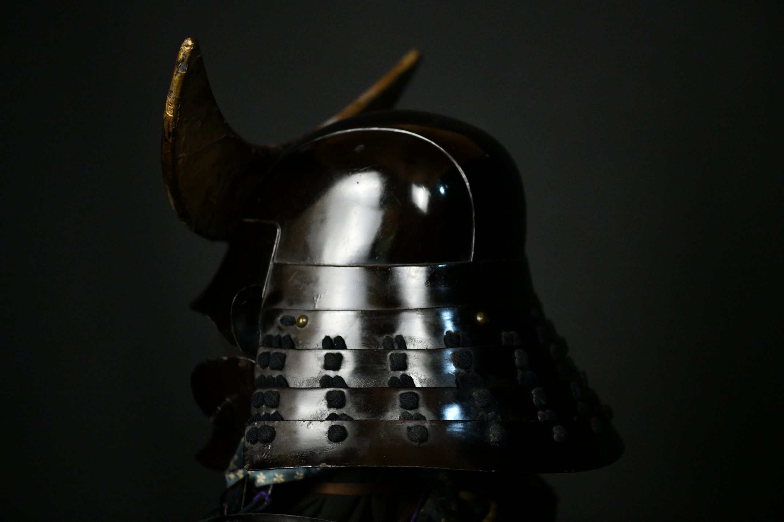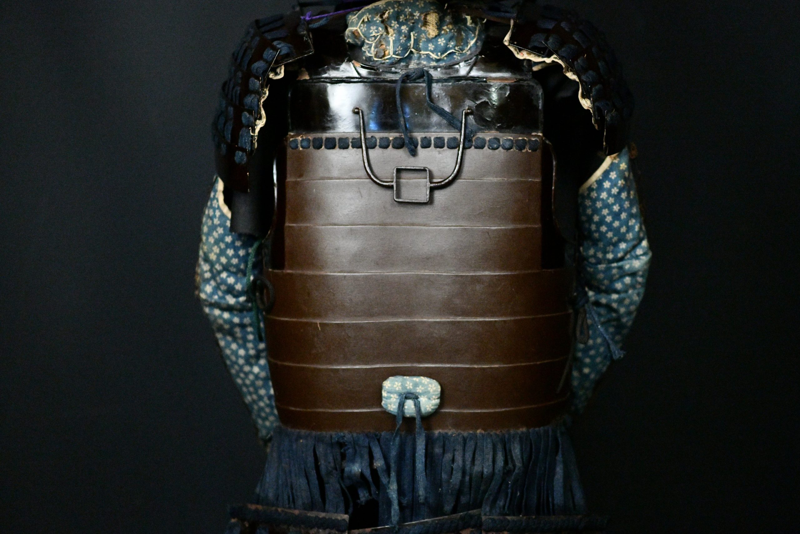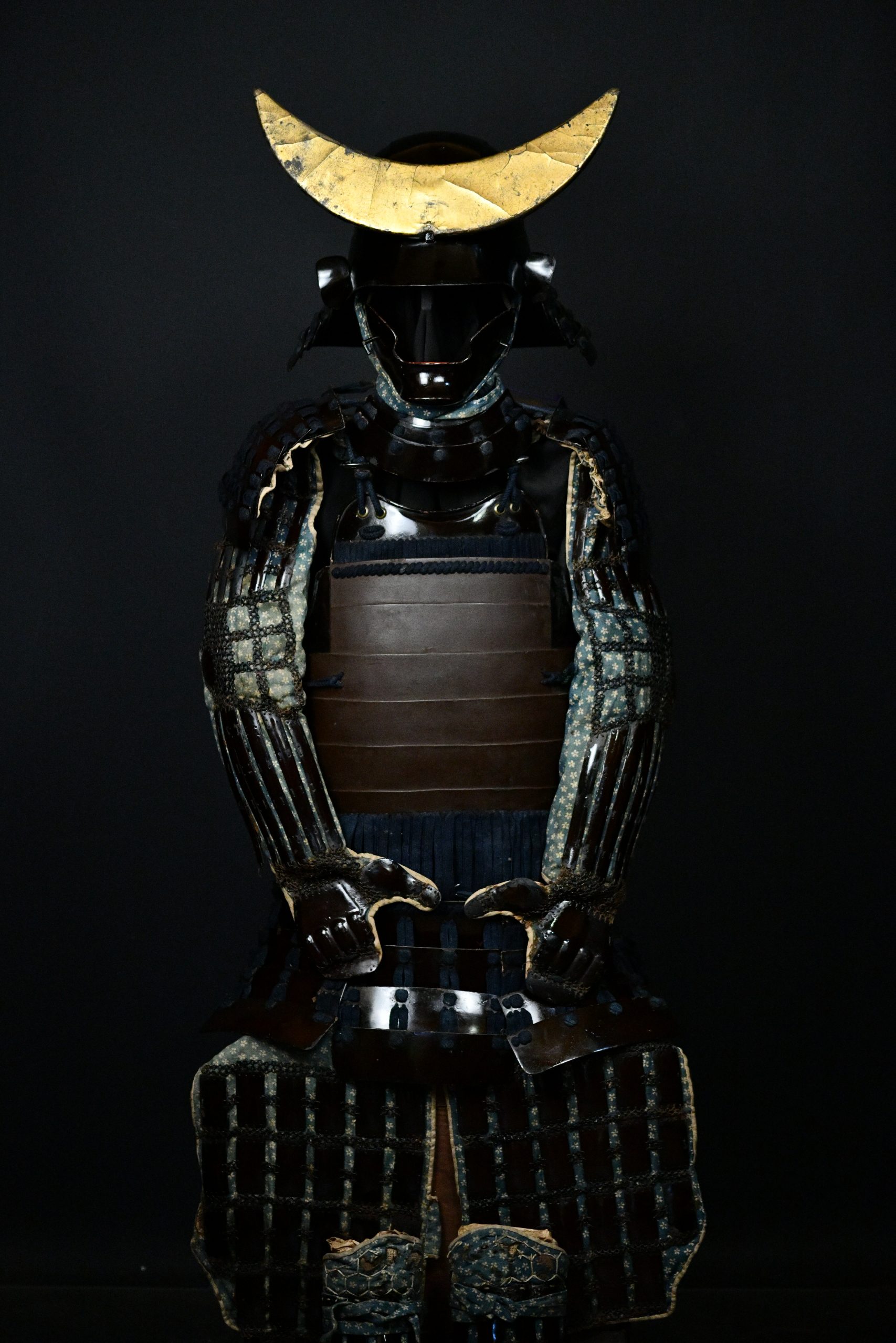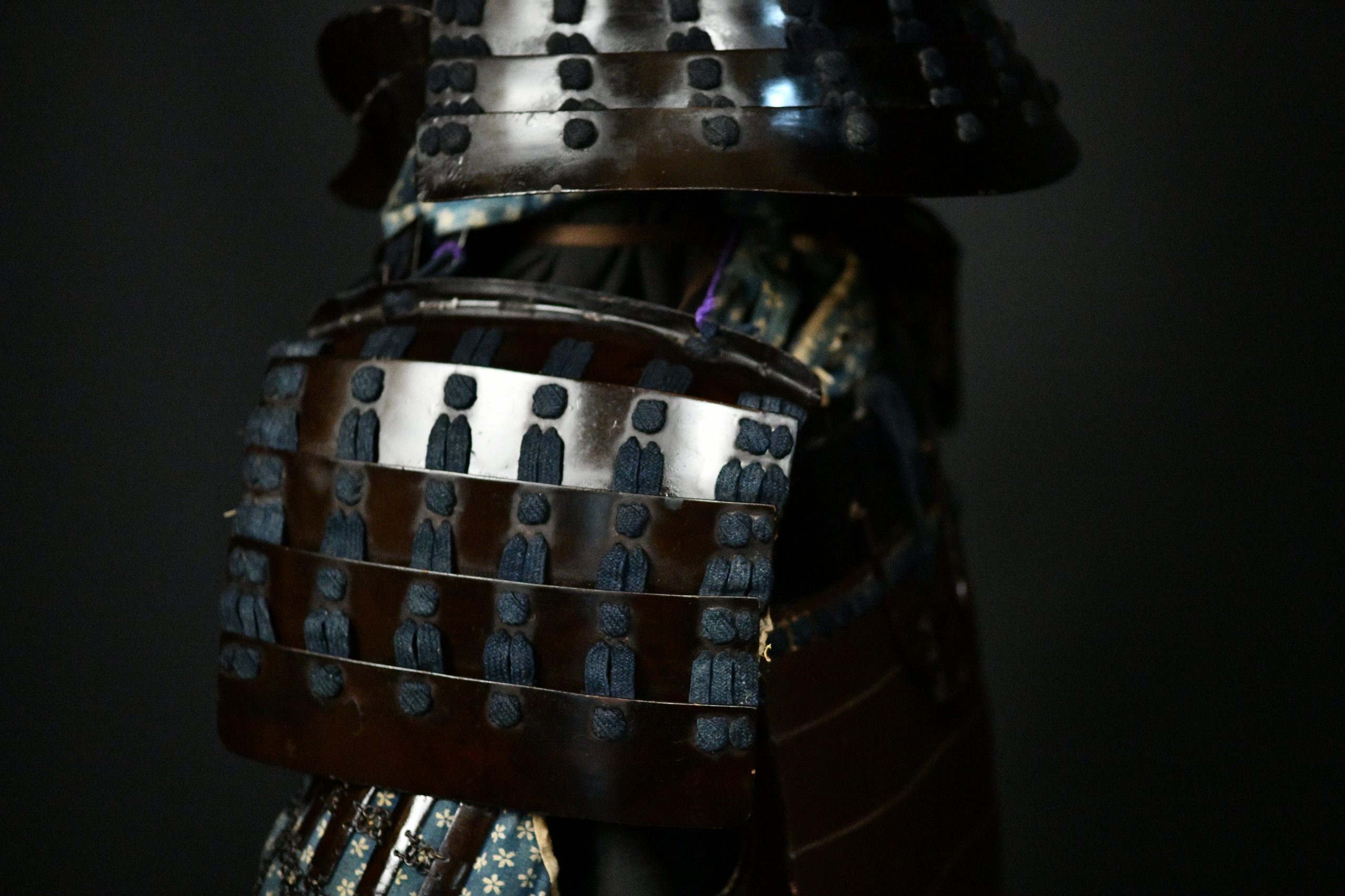 Cuirass (Dō): Yokohagi okegawa dō, lacquered black with indigo-blue lacing. Gold-trim shoulder accents.