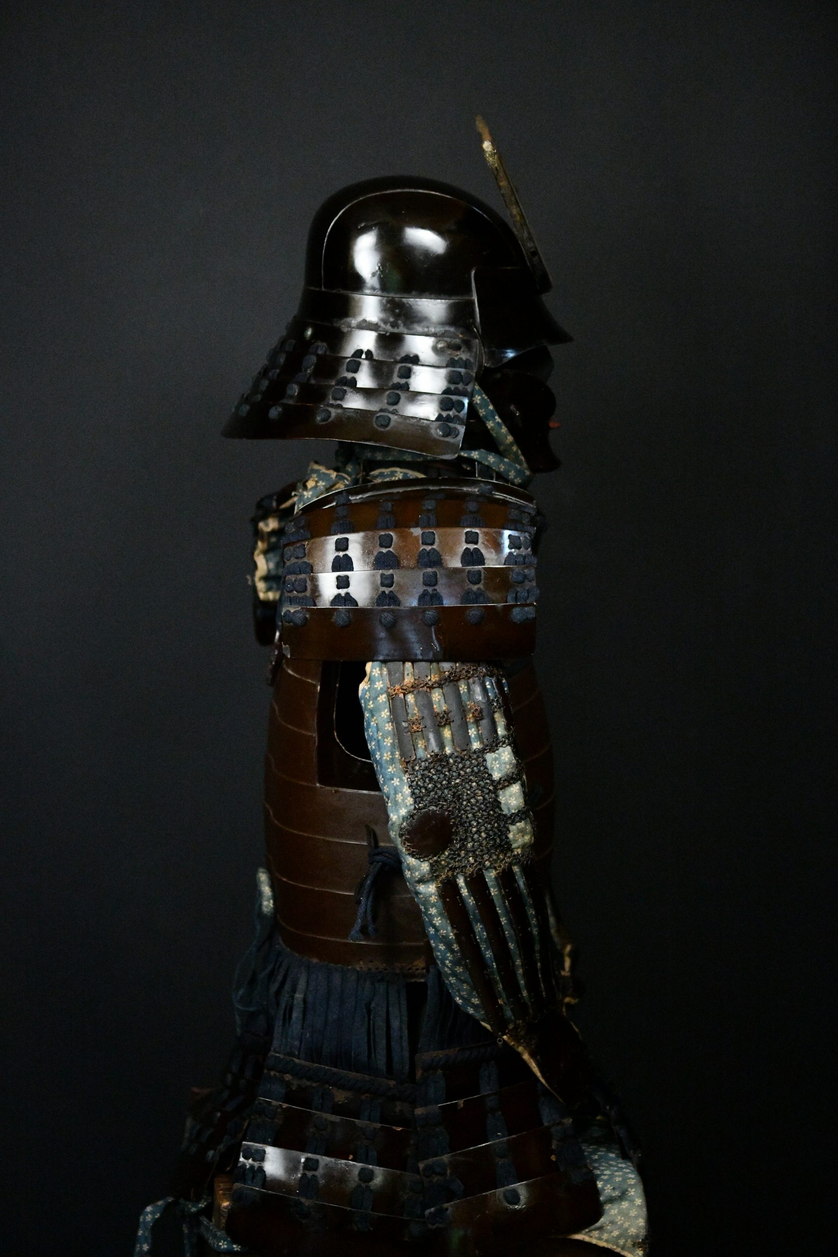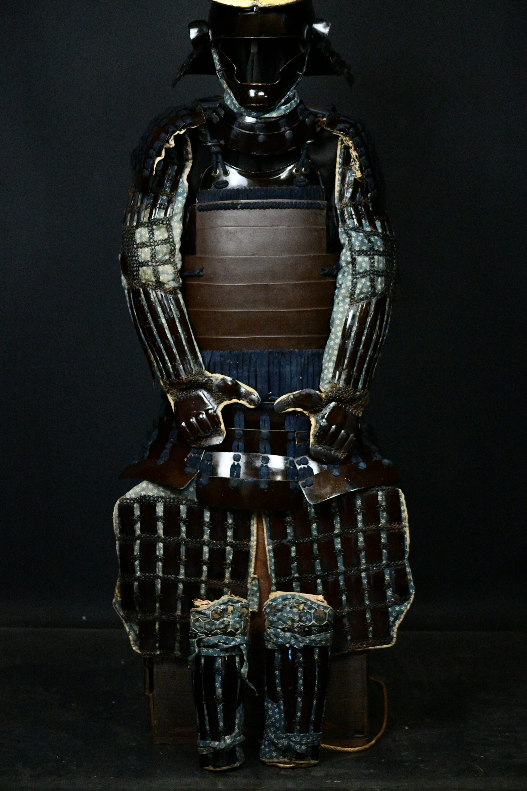 This complete Edo-period samurai armor is a stunning example of martial craftsmanship, distinguished by its dark elegance, robust construction, and ceremonial flair. The lacquered black dō is laced with deep blue cords, paired with thickly fur-trimmed kusazuri. The haidate features a unique checkerboard pattern alternating green fabric and embossed gilt plates — a rare and desirable aesthetic among collectors.