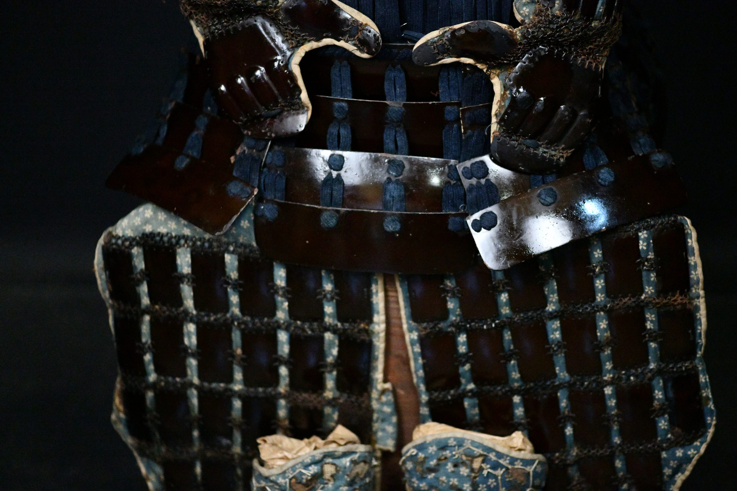 Thigh Guards (Haidate): Green/gold checker pattern; some plates etched with fine floral motifs.