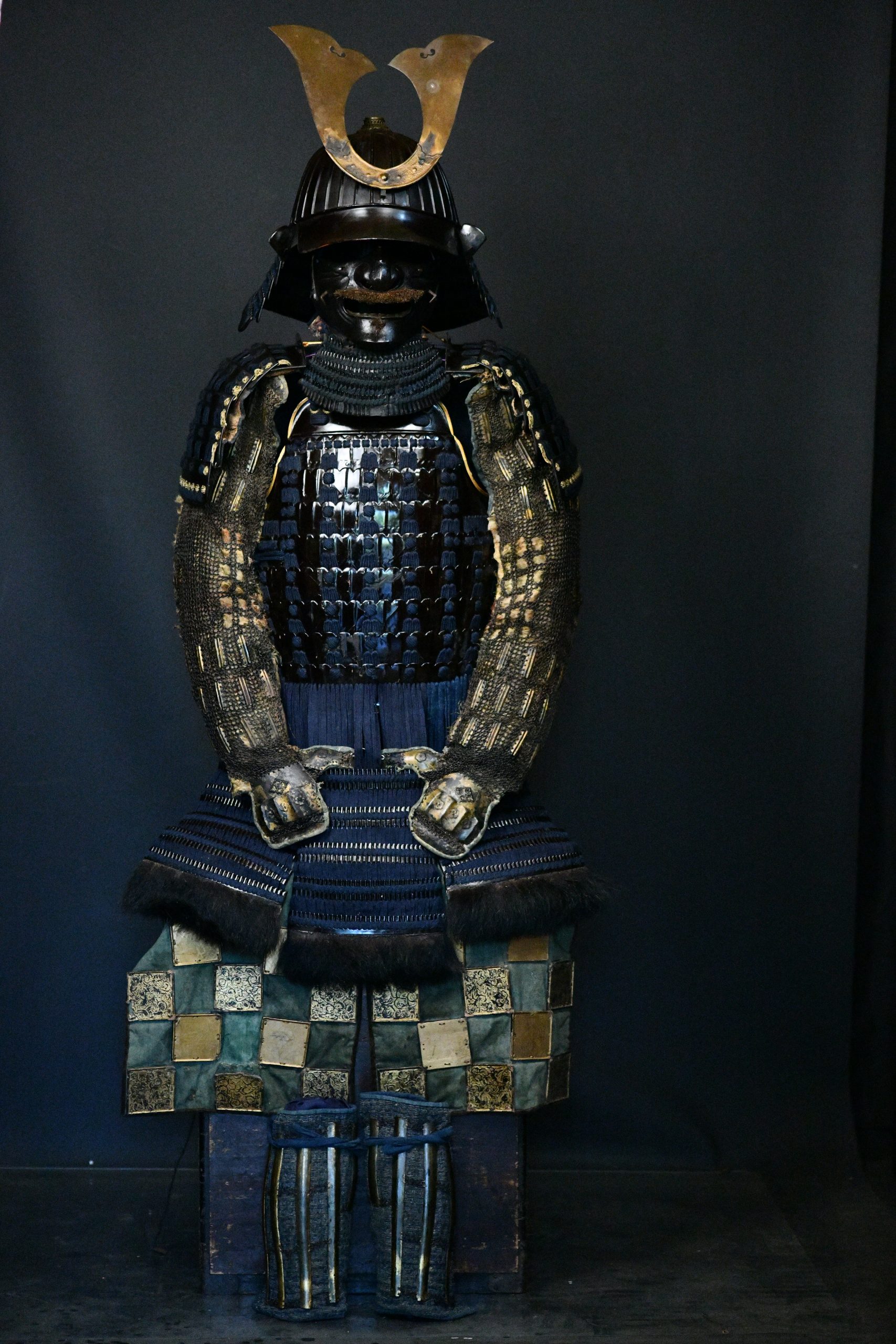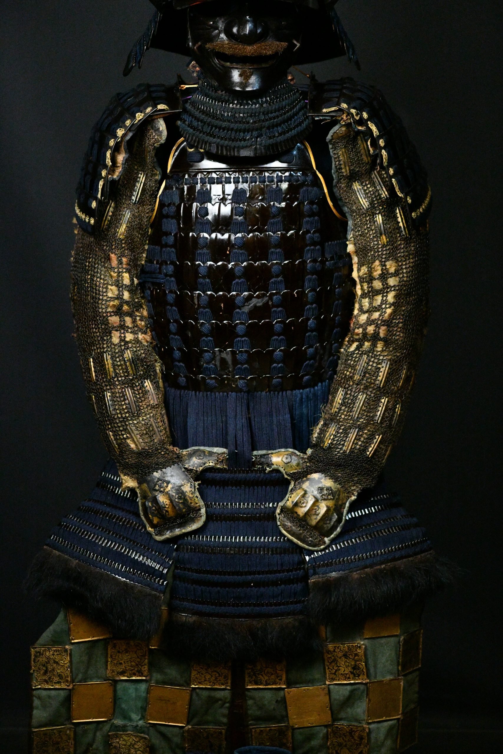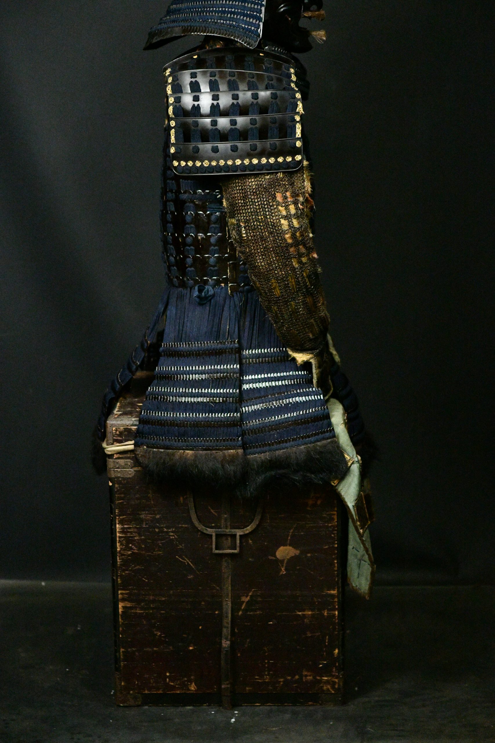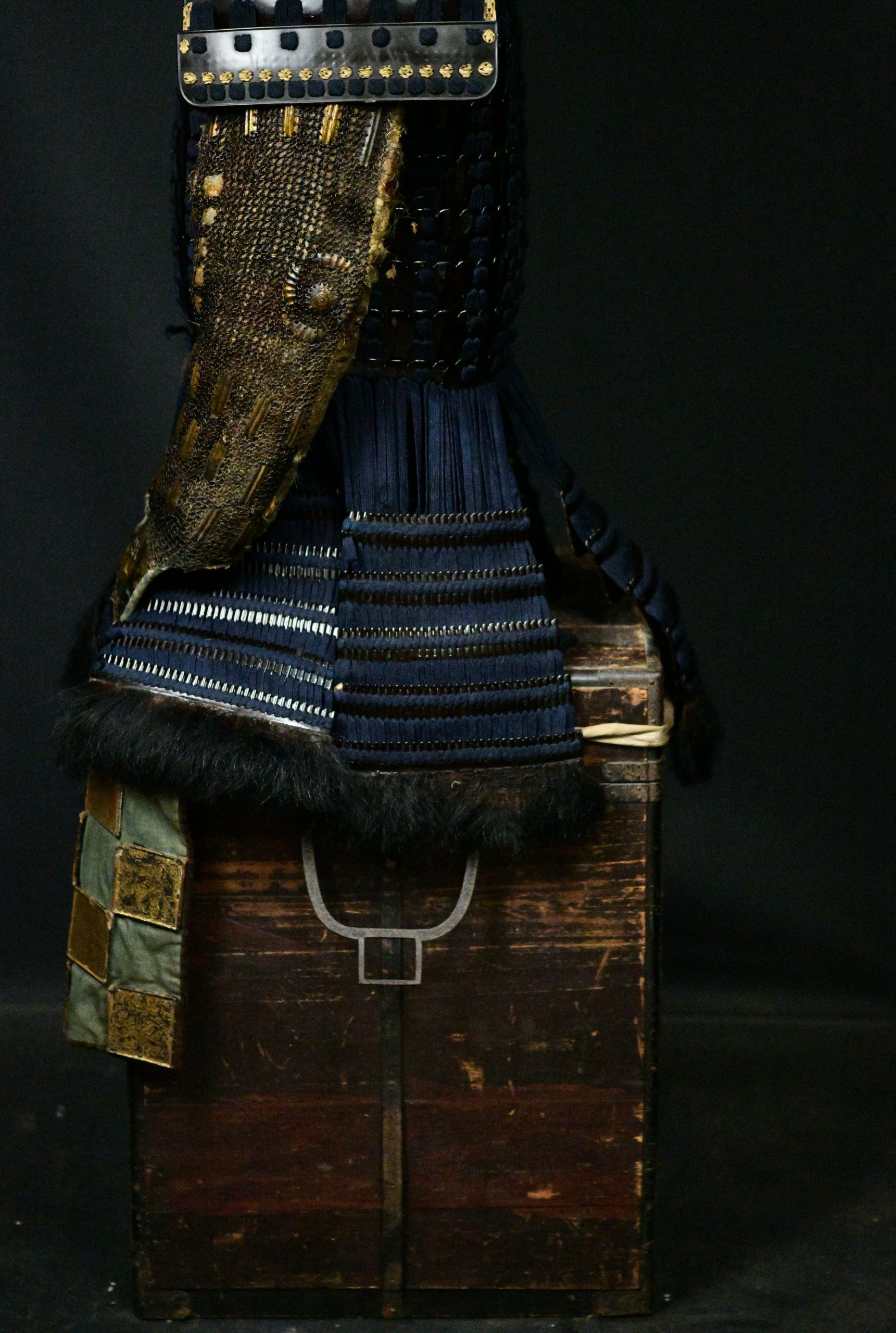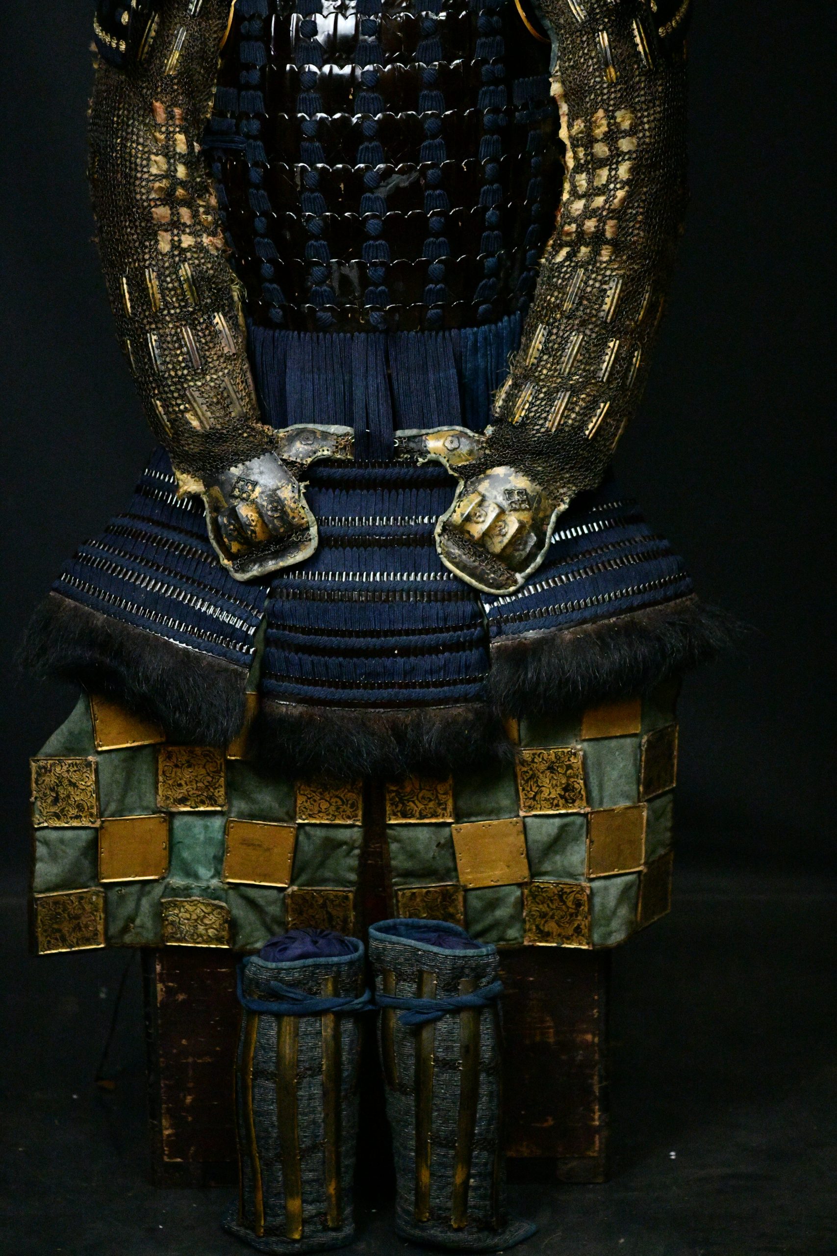 This complete Edo-period samurai armor is a stunning example of martial craftsmanship, distinguished by its dark elegance, robust construction, and ceremonial flair. The lacquered black dō is laced with deep blue cords, paired with thickly fur-trimmed kusazuri. The haidate features a unique checkerboard pattern alternating green fabric and embossed gilt plates — a rare and desirable aesthetic among collectors.
