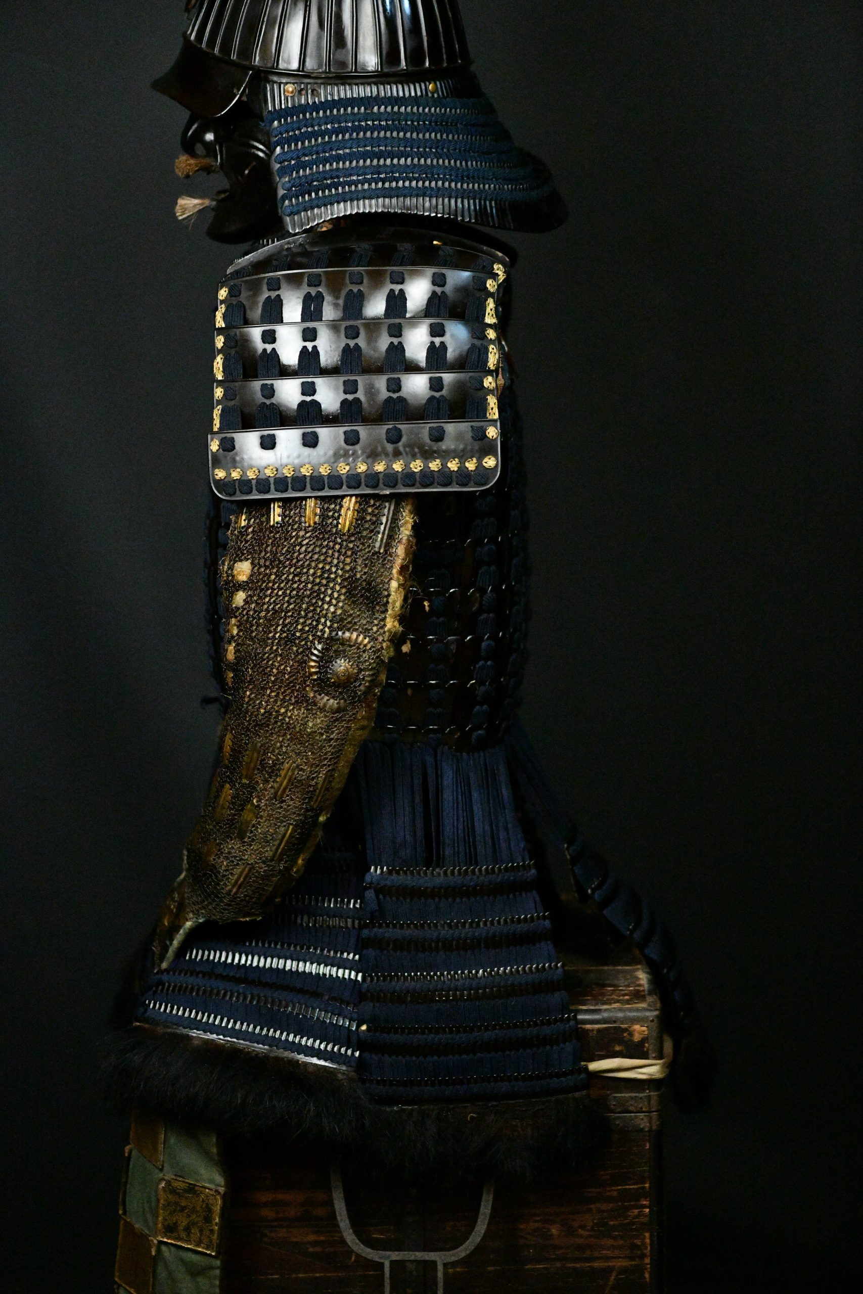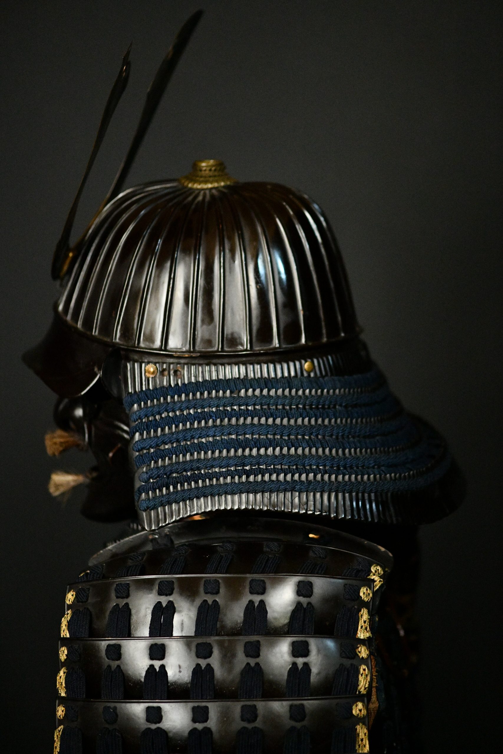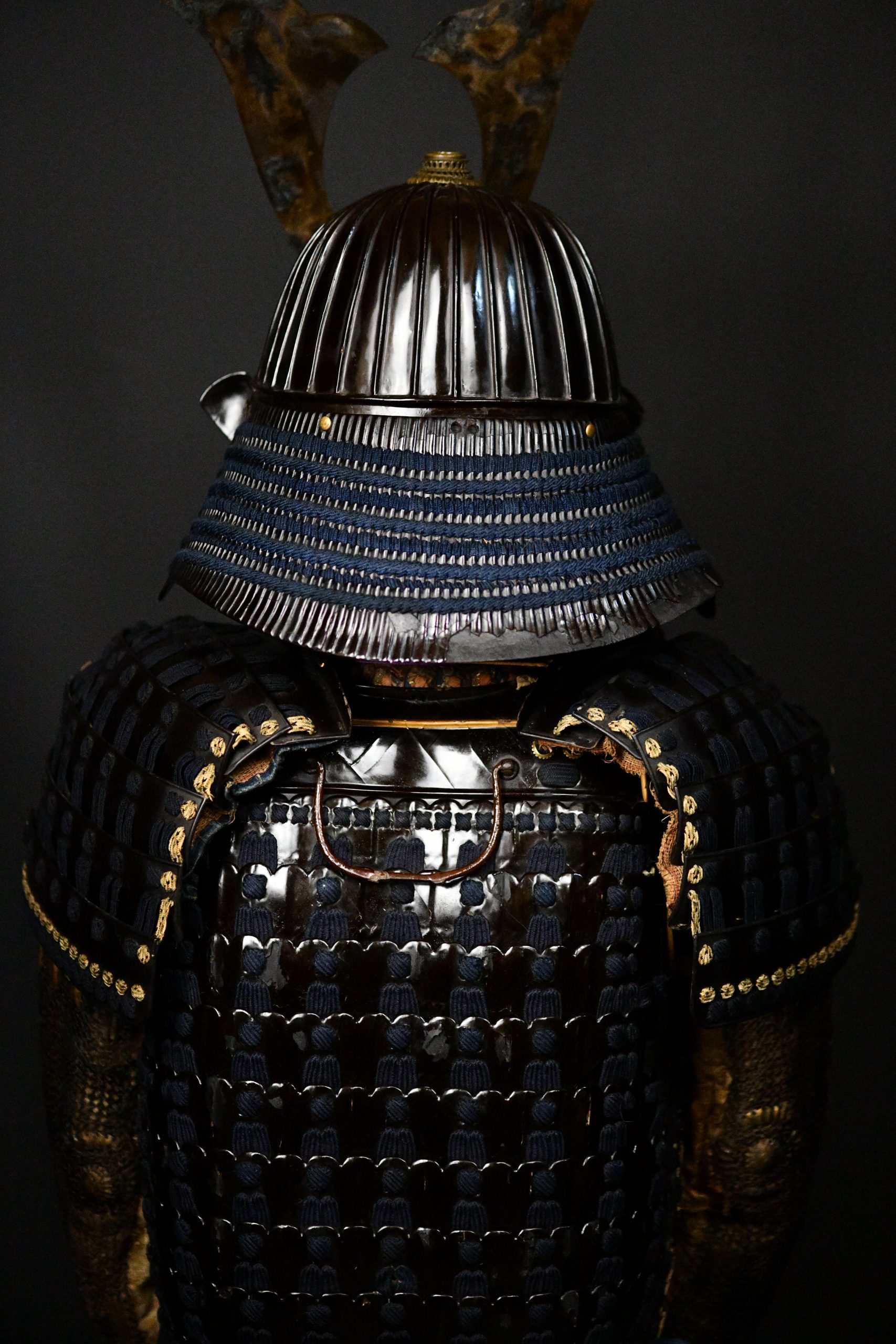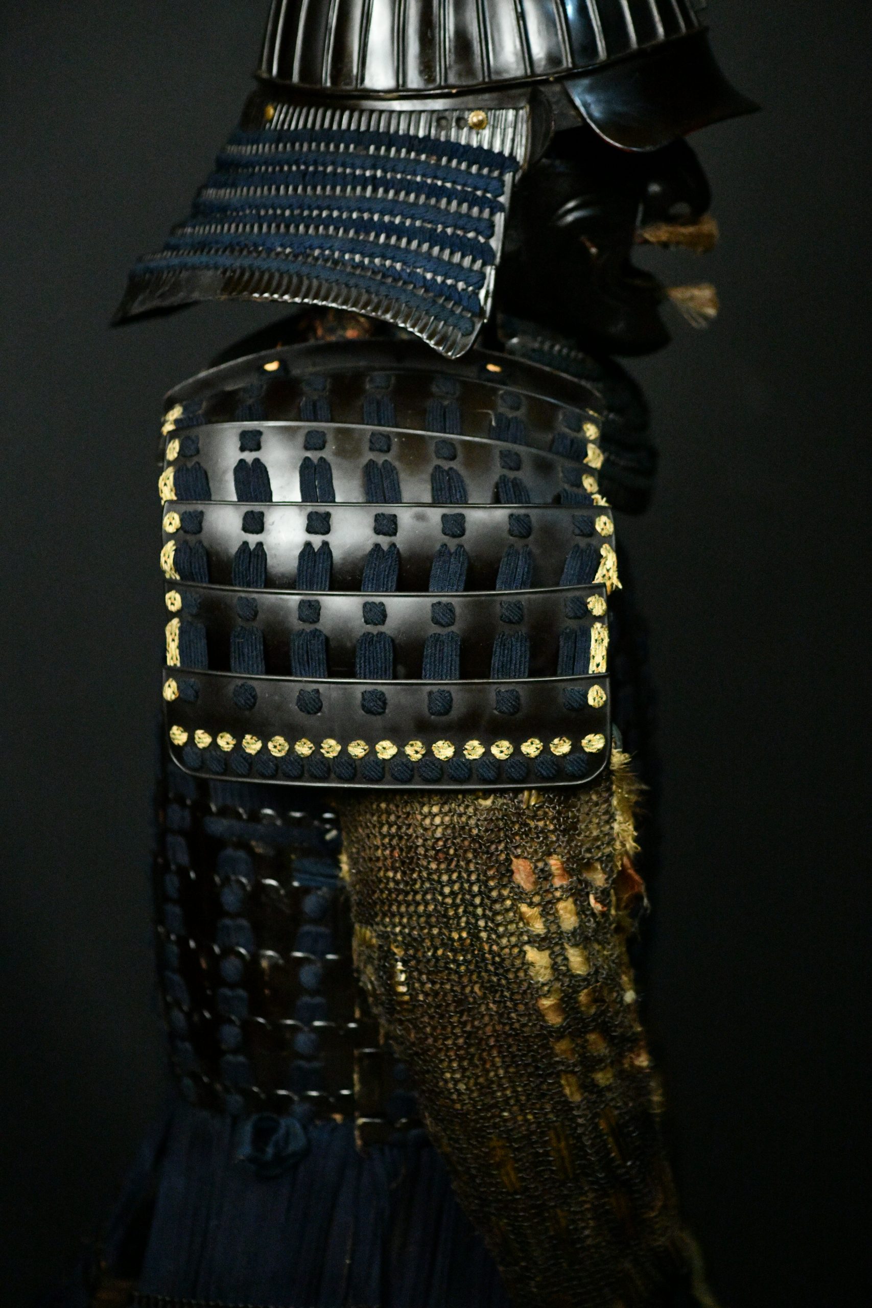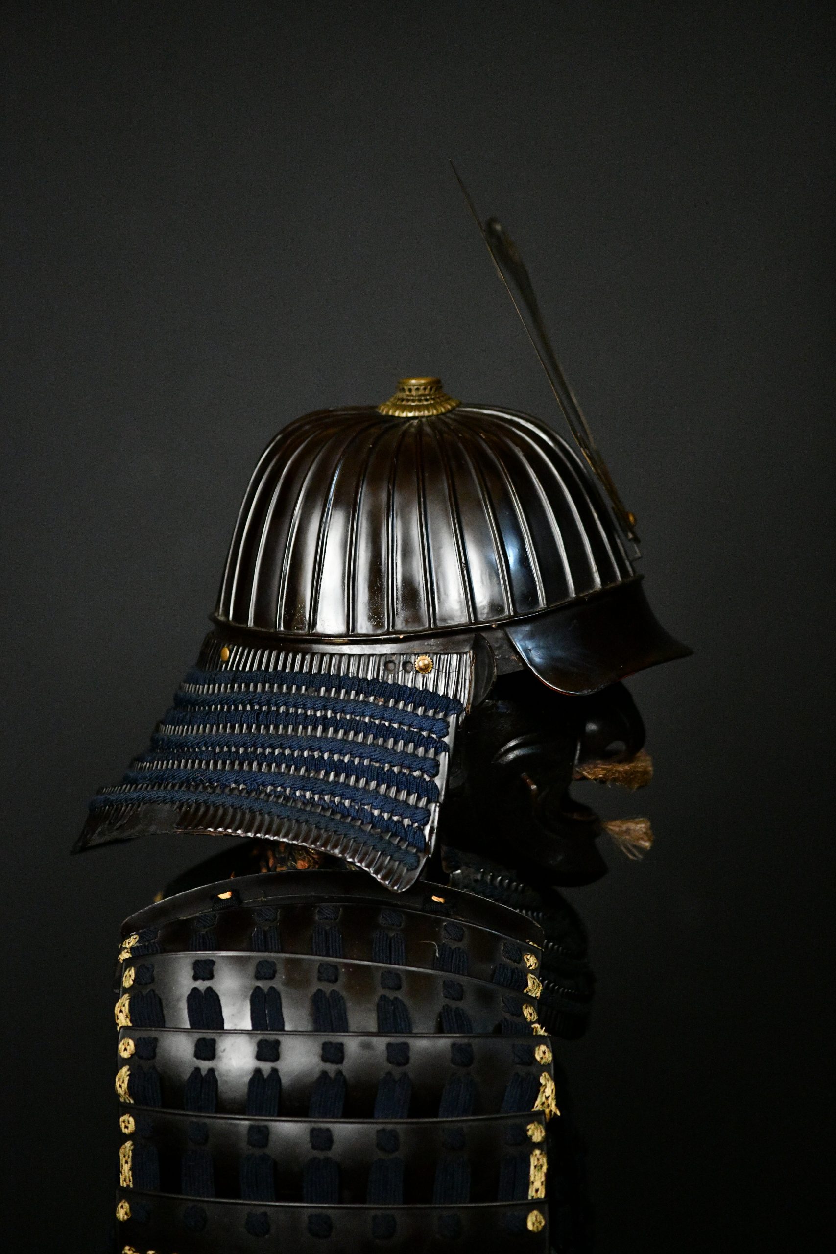 Cuirass (Dō): Yokohagi okegawa dō, lacquered black with indigo-blue lacing. Gold-trim shoulder accents.