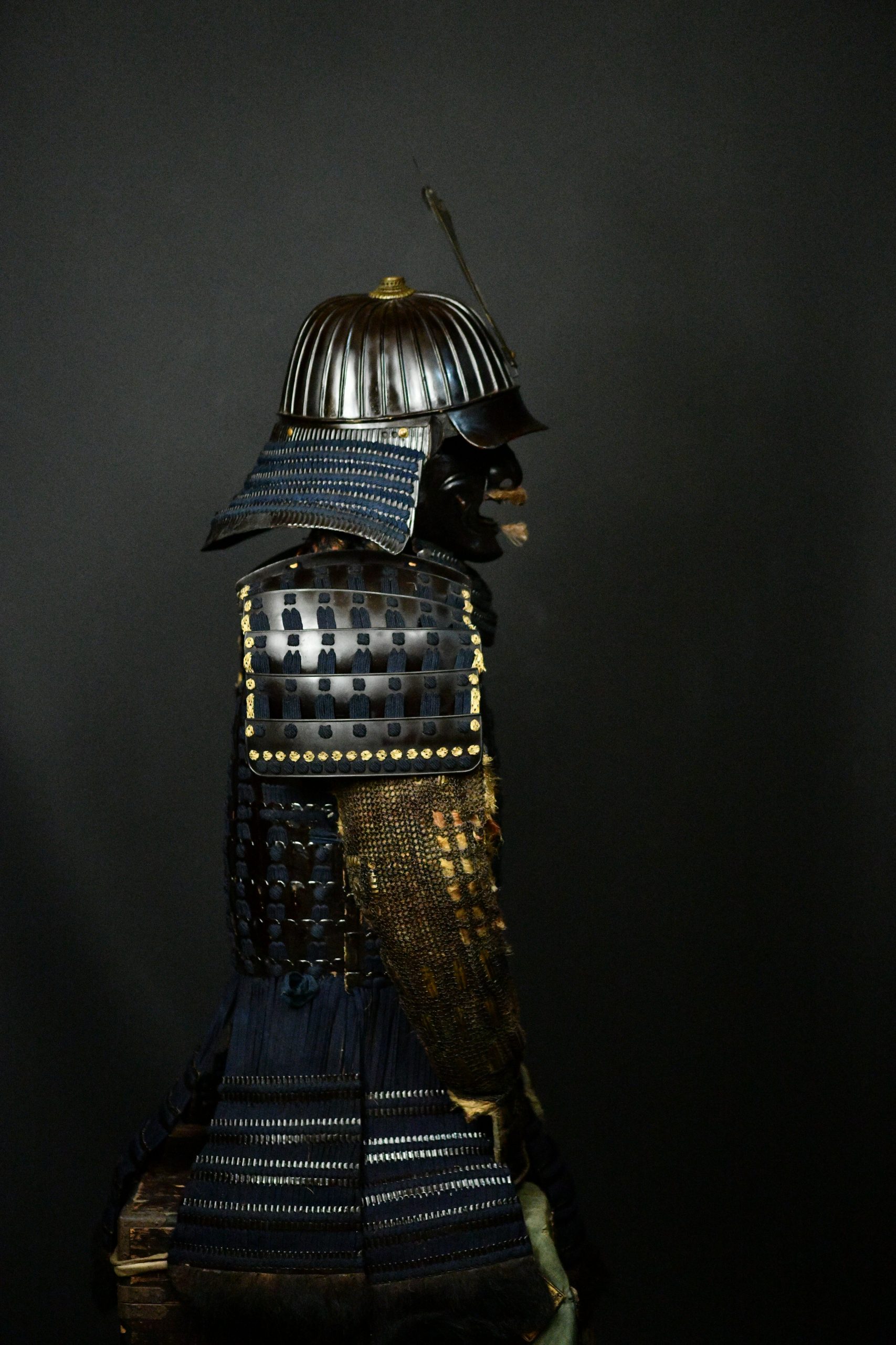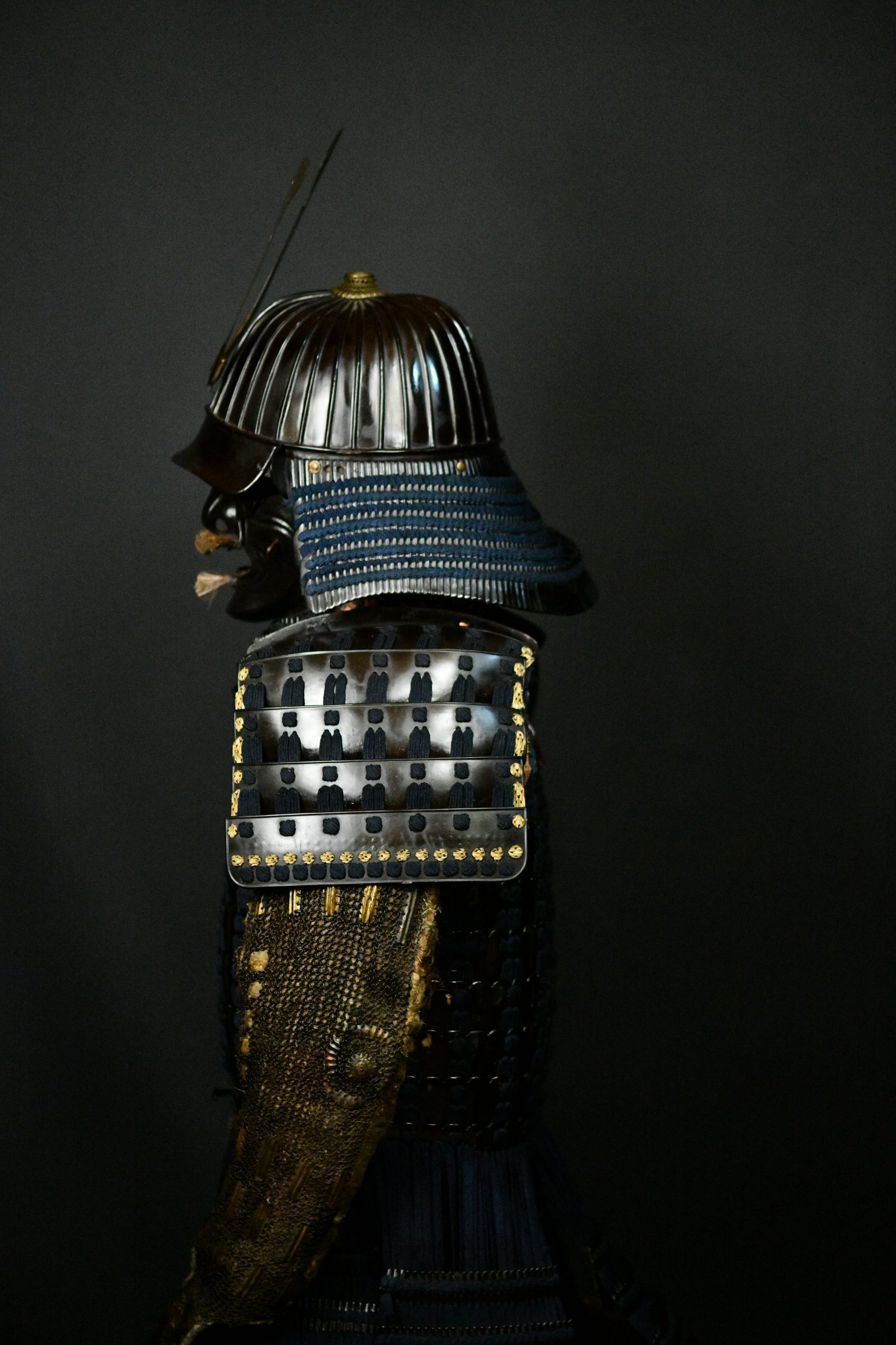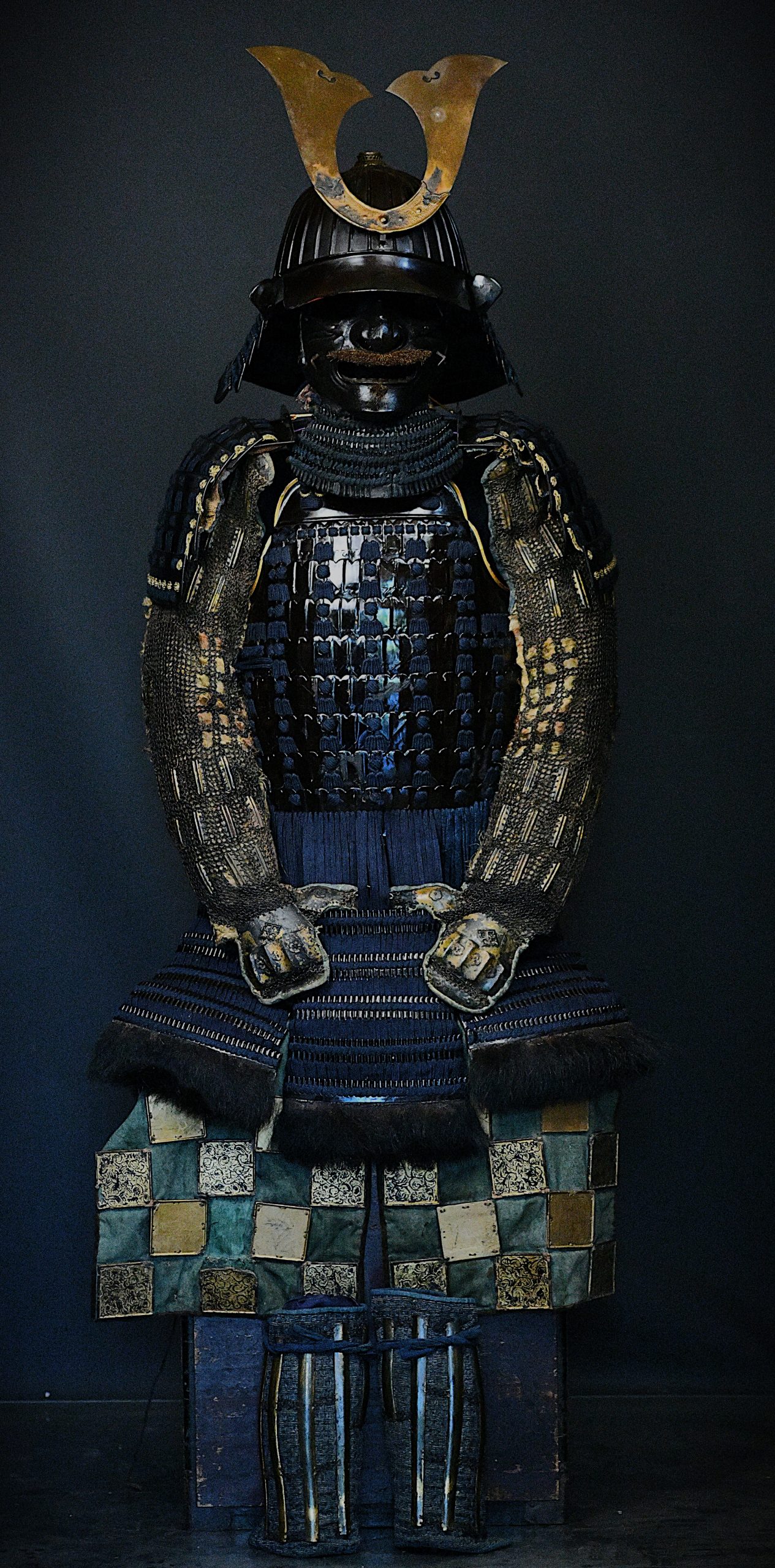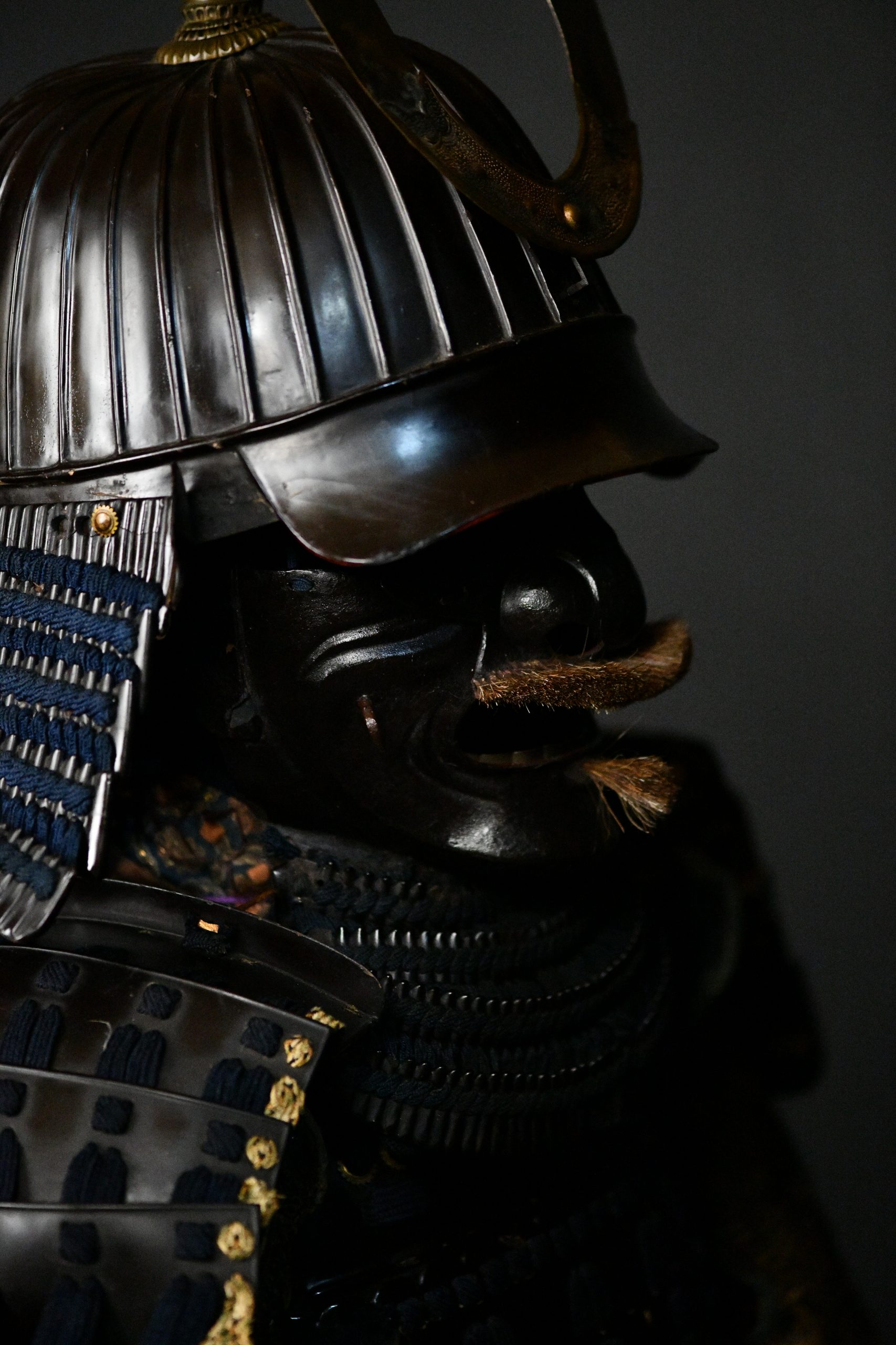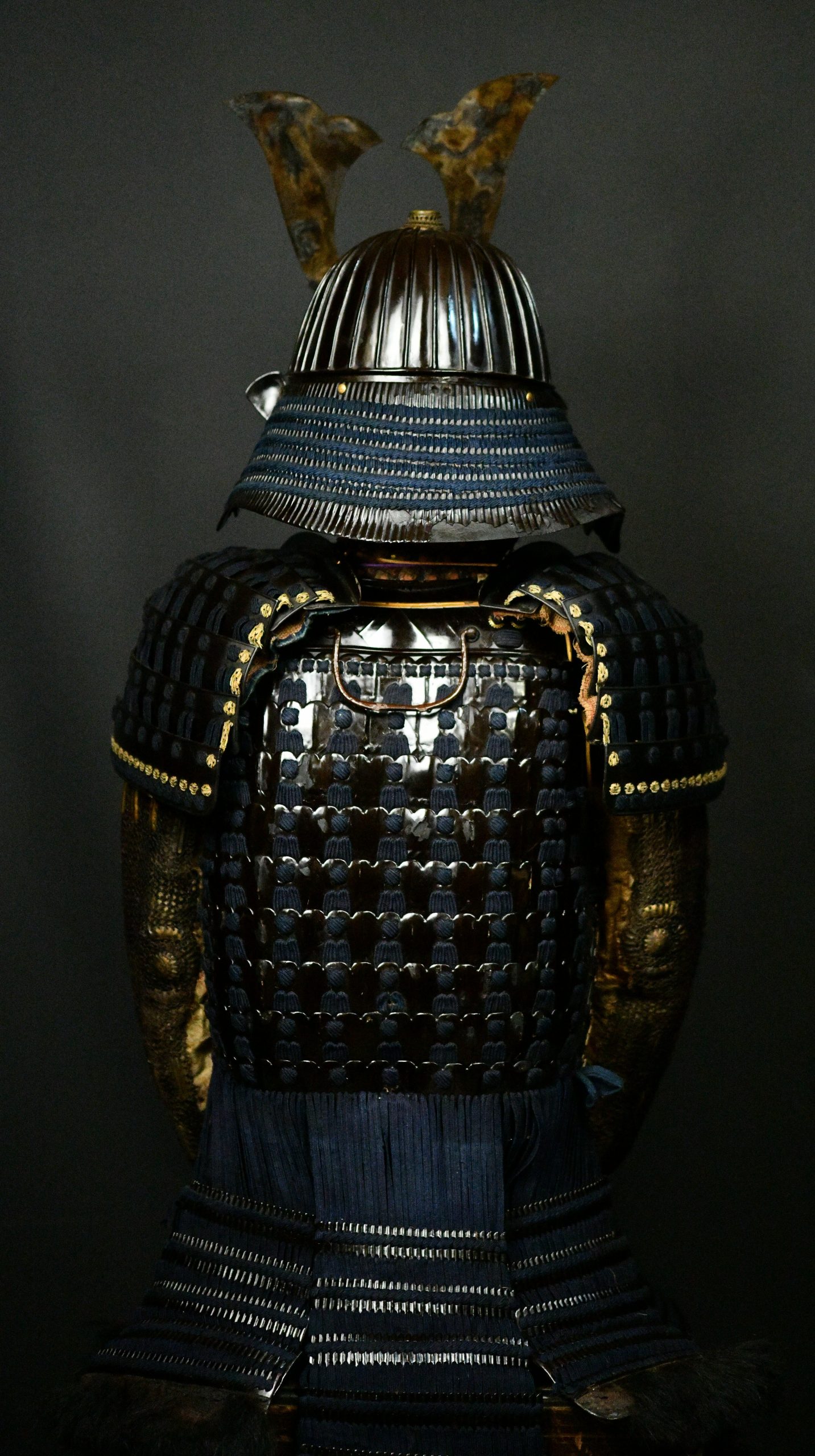 Cuirass (Dō): Yokohagi okegawa dō, lacquered black with indigo-blue lacing. Gold-trim shoulder accents.