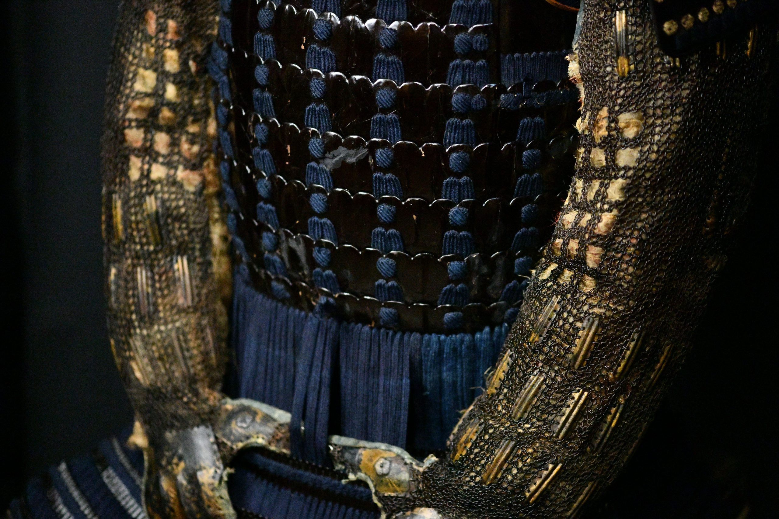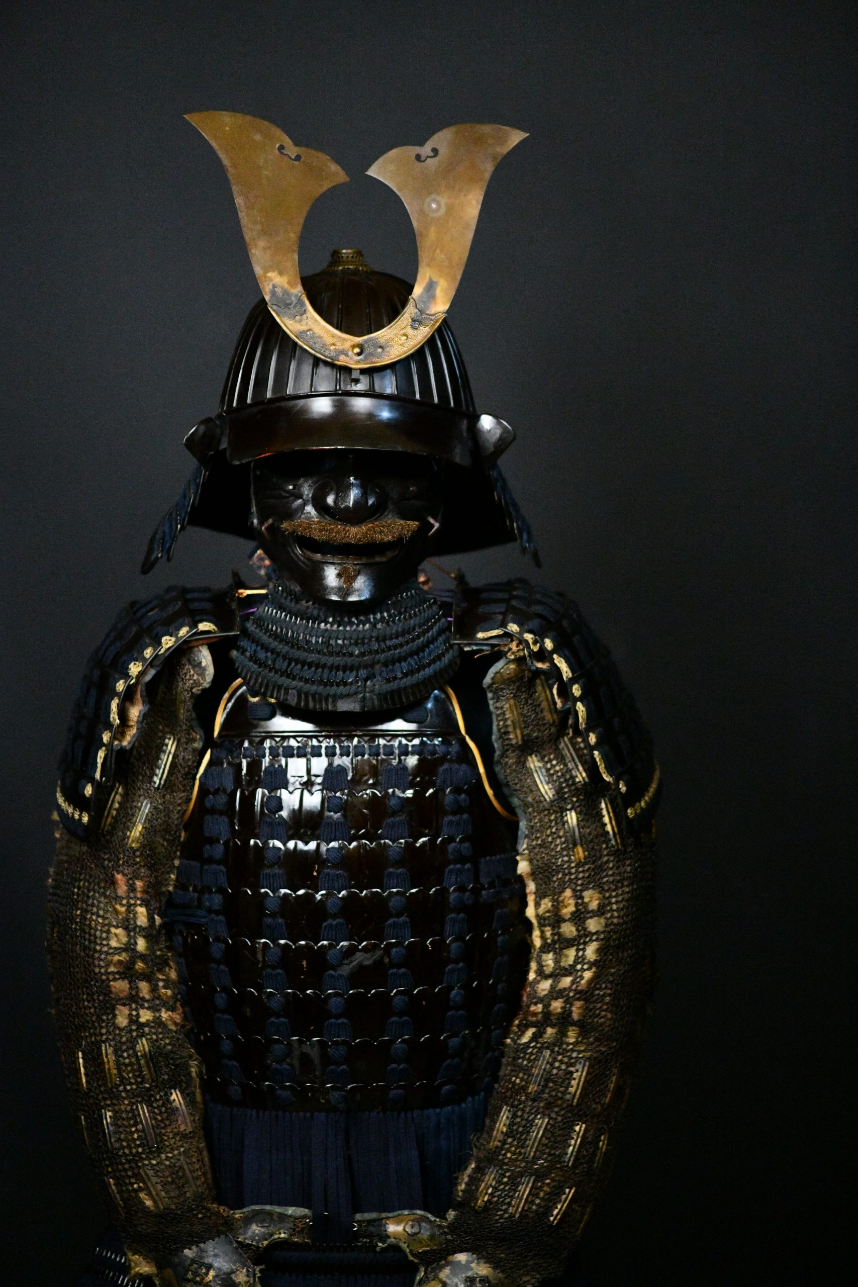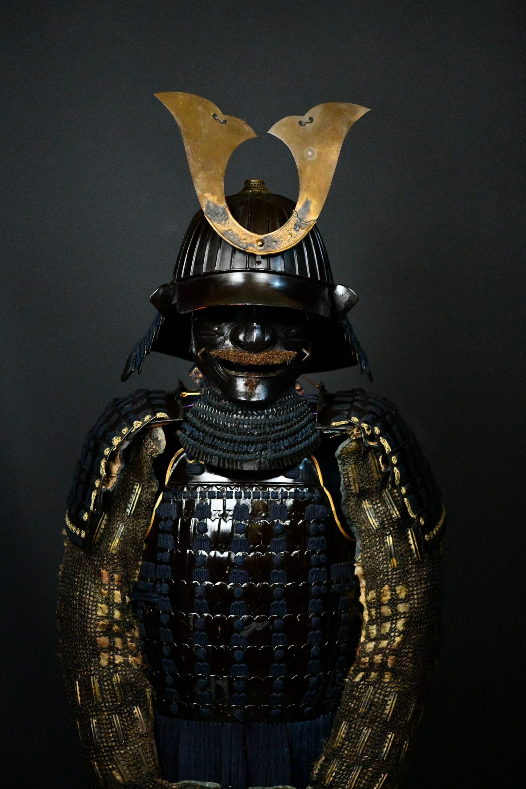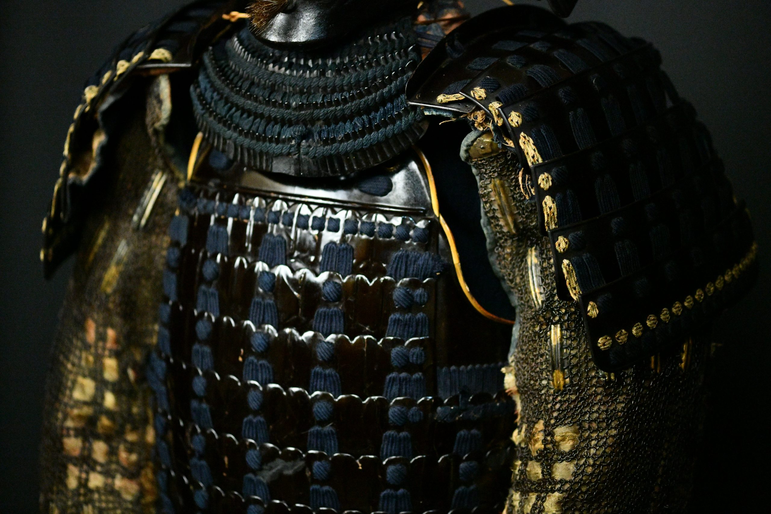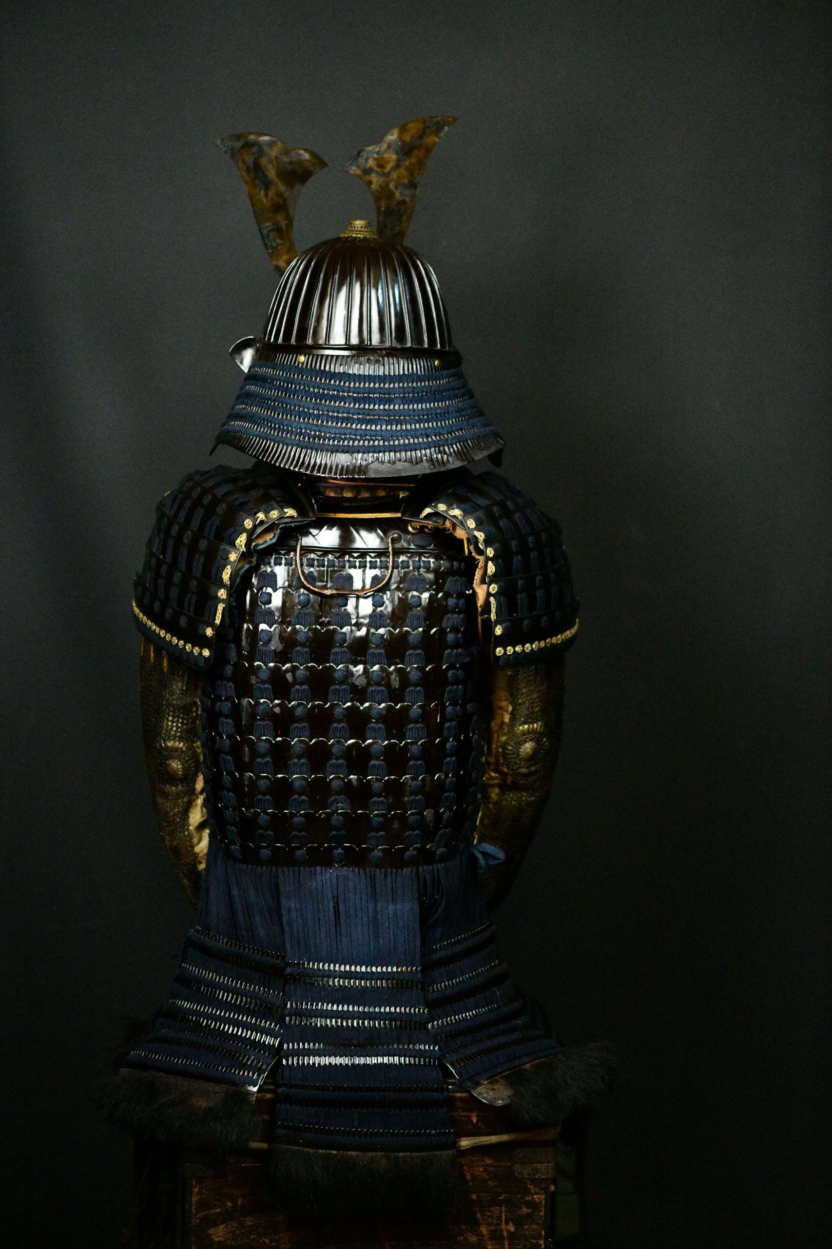 Cuirass (Dō): Yokohagi okegawa dō, lacquered black with indigo-blue lacing. Gold-trim shoulder accents.