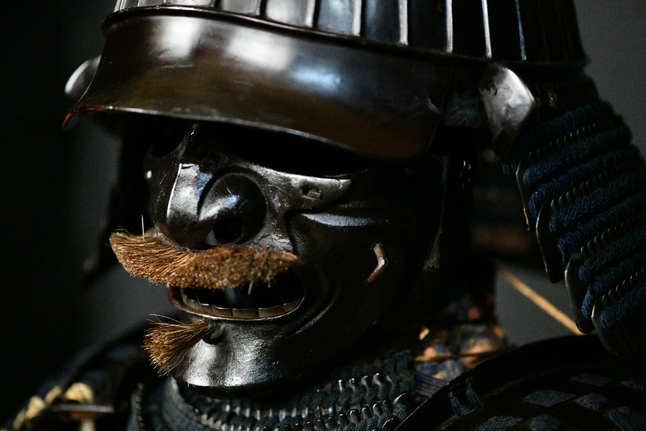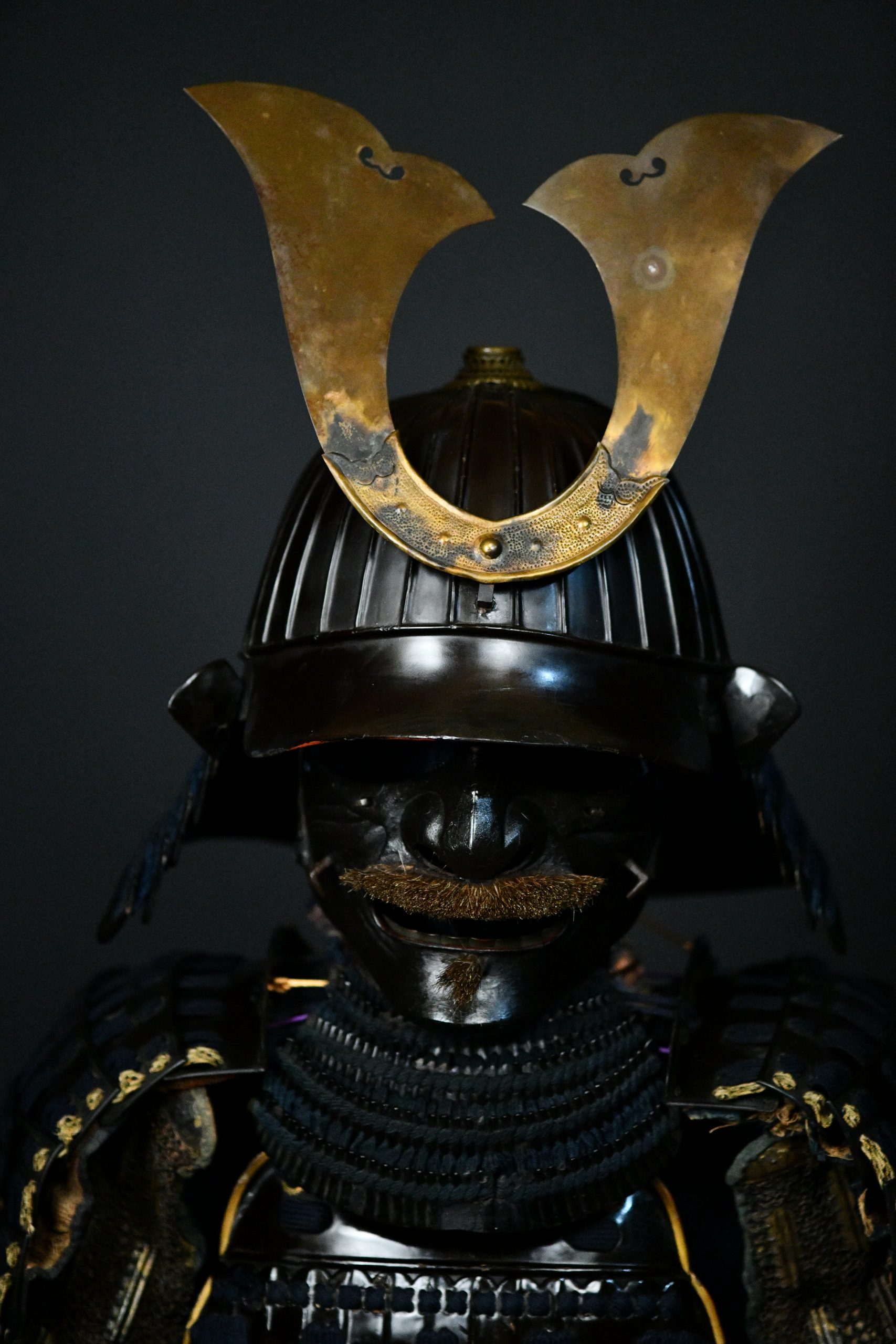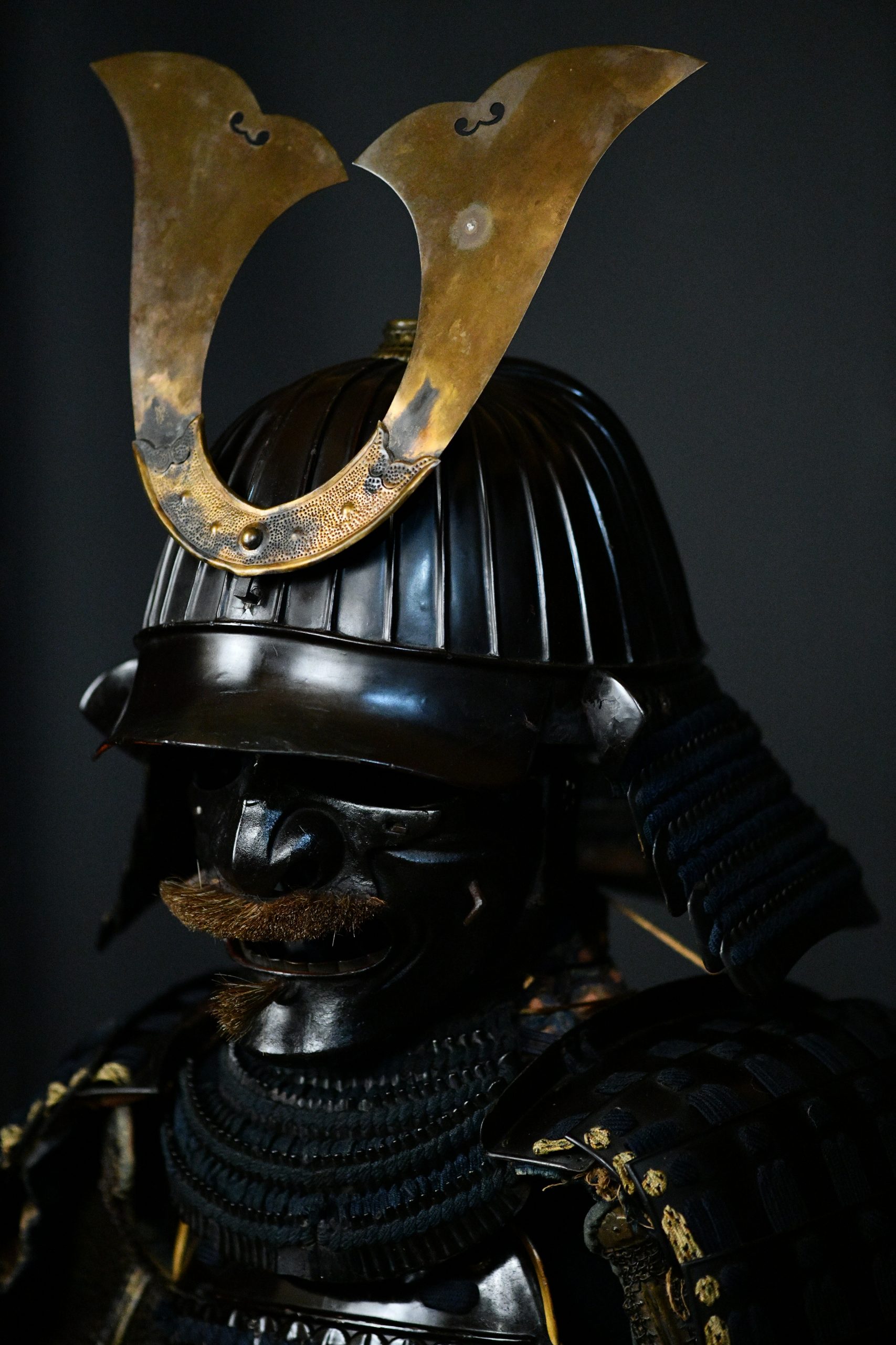 The suji bachi kabuto helmet, crowned with a bold double crescent maedate, commands presence. The ressei menpō mask beneath bears a fierce expression with a bristled mustache, protecting the face while imbuing a sense of character.