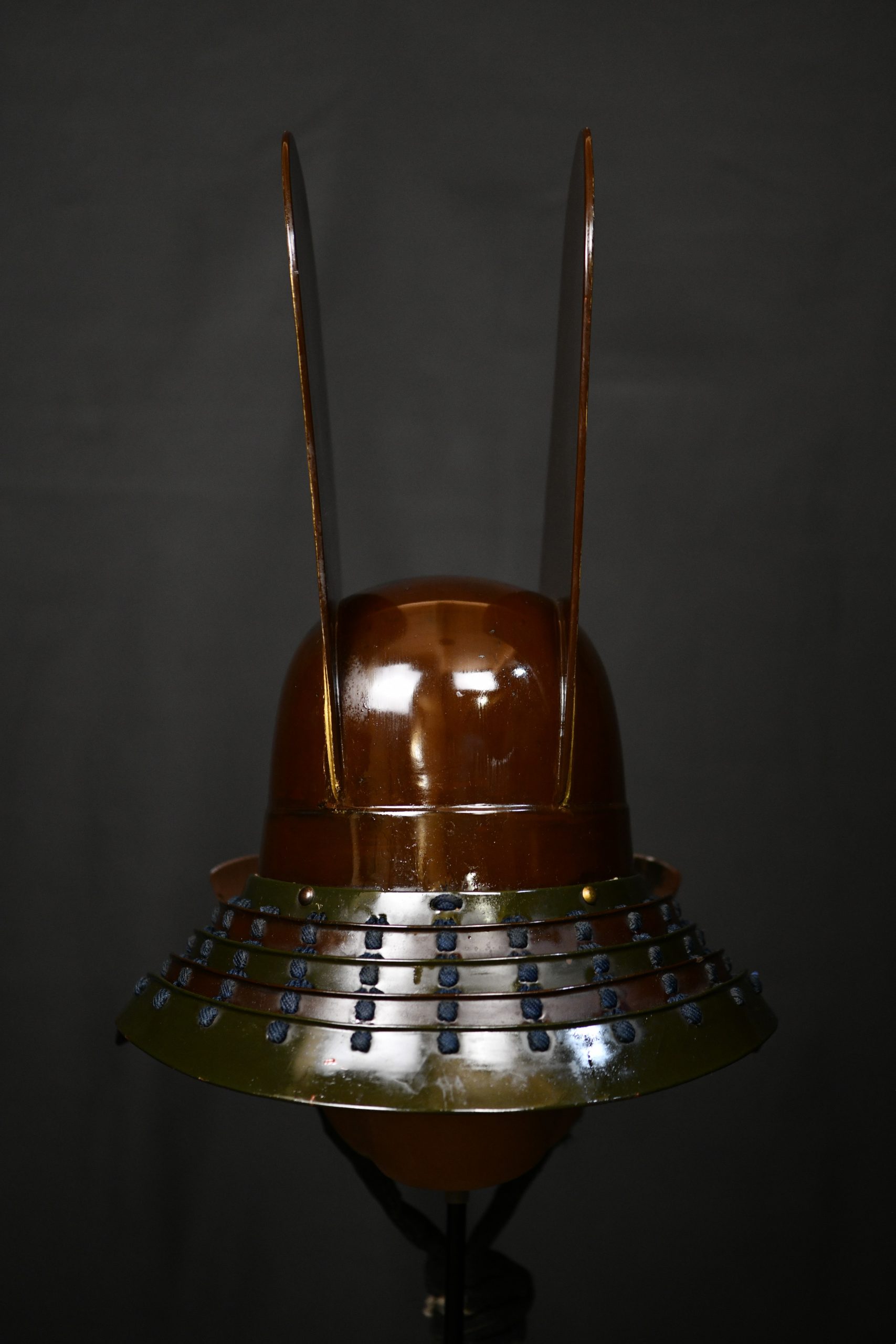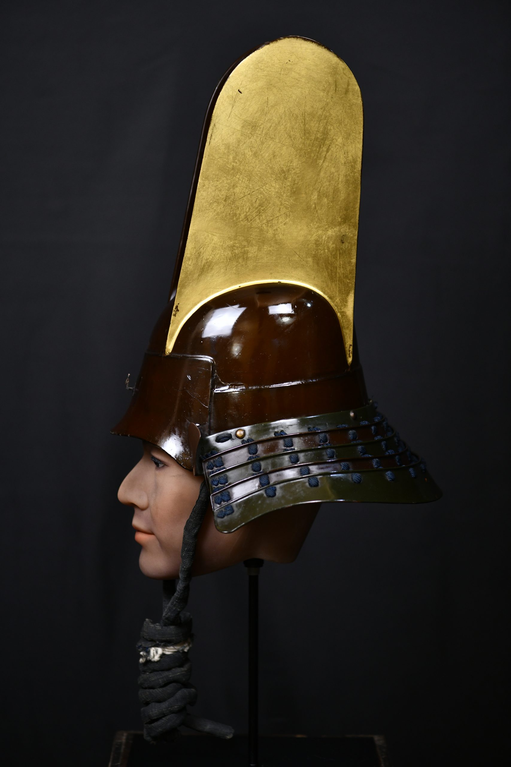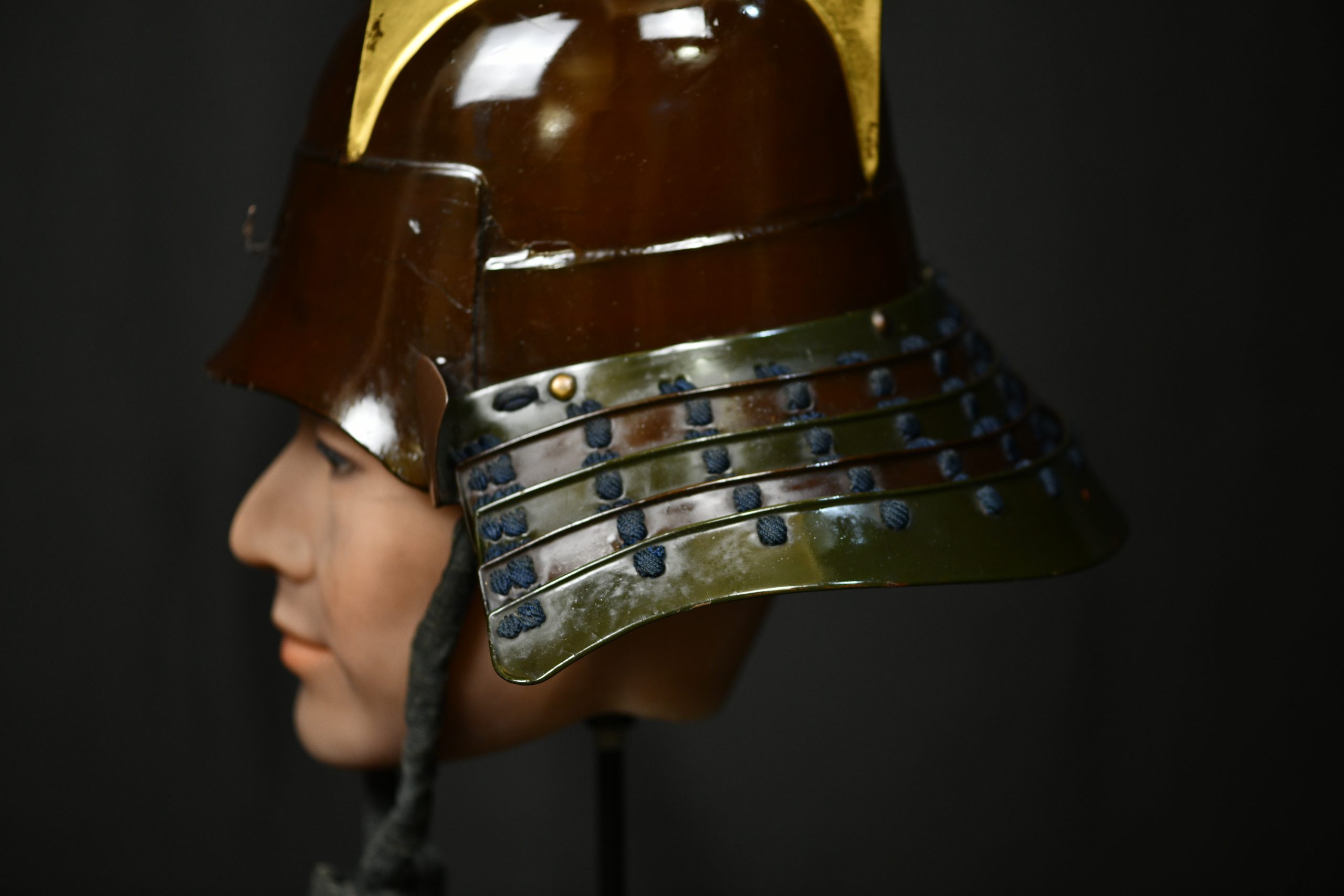 Magnificent and very old museum piece in a very good state of preservation given its age that also retains its original transport box and a Certificate NBTHK Tokobetsu kicho NBTHK high rank. This helmet is a unique piece as it has it all. Belonging to the early to mid Edo period, this Kawari style kabuto with Kabuto zunari base is a very rare piece and for the best collectors to be proud of as it certainly has the quality to be displayed in the best museums in the world. The kawari style used to be the favorite of the highest samurai class and the Daimyos or feudal lords as they were exclusive personalized works and no two were exactly alike. It can be seen for example in the shikoro slats, interspersed in brown lacquer and another with a greenish tone, the latter very rare since I had never seen a lacquer with that tone and it was certainly very difficult to achieve. The costs were obviously much higher than the classic kabutos, this one was even transported in its own box with appropriate measures, made of wood and reinforced with iron and handles. The certificate also revalues and secures it over time, making it a great investment since there are less and less of these special items and most of them are already part of high level private collections or exhibited in museums.