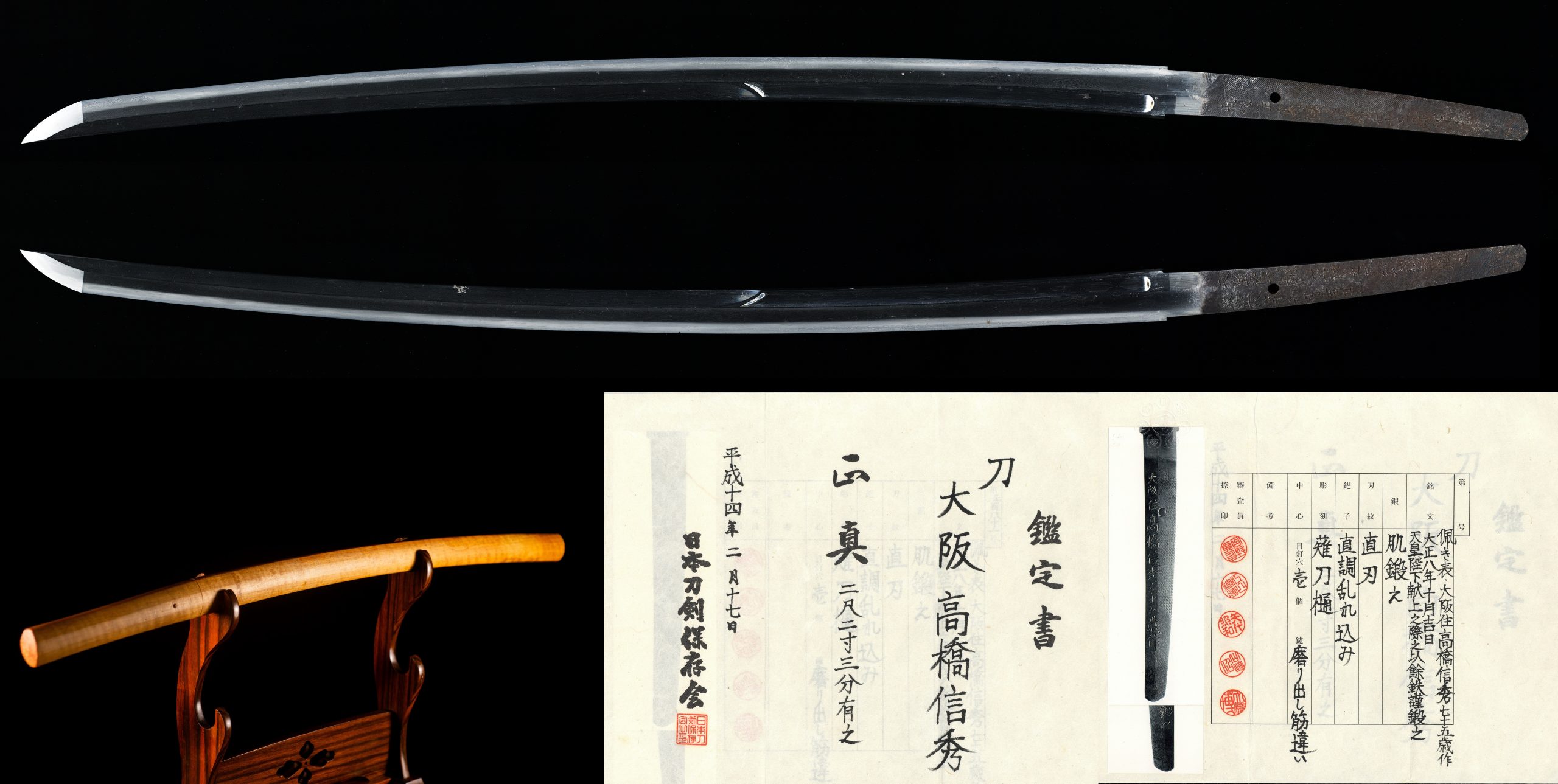 The blade is signed 大阪住 高橋信秀 (Ōsaka-jū Takahashi Nobuhide; sometimes rendered “Nobushide”) and dated 大正八年十二月吉日 (December 1919, Taishō 8). The nakago inscription adds an exceptionally uncommon, document-backed statement: “天皇陛下献上之際々…”, i.e., an explicit reference to an occasion of献上 (presentation/offering) to His Majesty the Emperor, together with the use of 余鉄 (yotetsu) in the forging. This is not modern marketing language: it appears both in the kanteisho and the official torokusho.