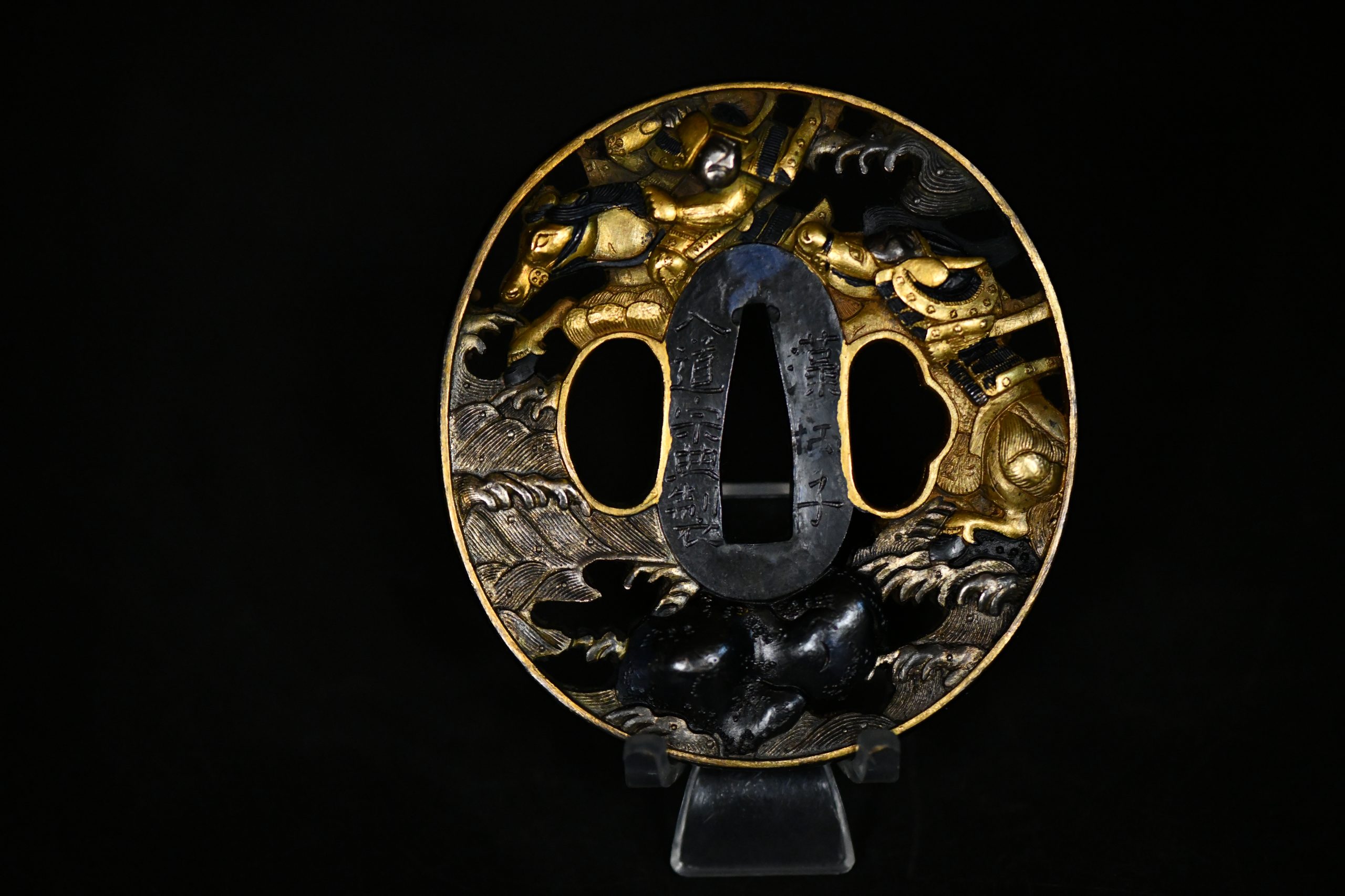 The scene is rendered in pronounced takabori with effective depth and layering. The warrior’s armor, the horse’s anatomy, and the flowing wave forms are all articulated with confident chiseling, creating a vivid sense of motion across the surface. The use of iroe metal accents further enriches the visual hierarchy and is fully consistent with Edo period decorative sword fittings.