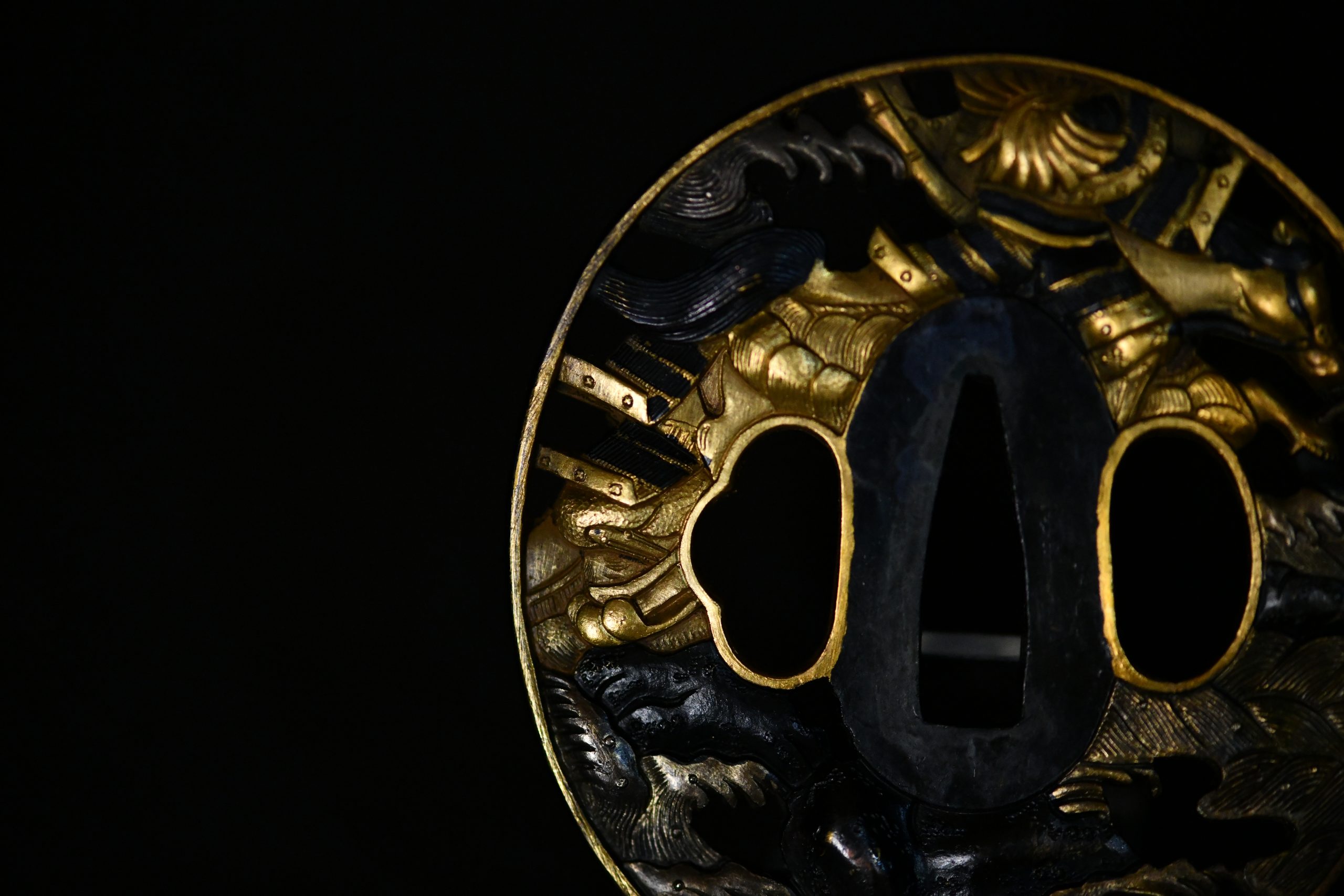 Overall, this is an attractive and technically accomplished Edo period Sōten-signed tsuba, notable for its strong visual presence, refined shakudō ground, and richly gilded high-relief decoration—an excellent example of the enduring appeal of the Sōten school aesthetic.