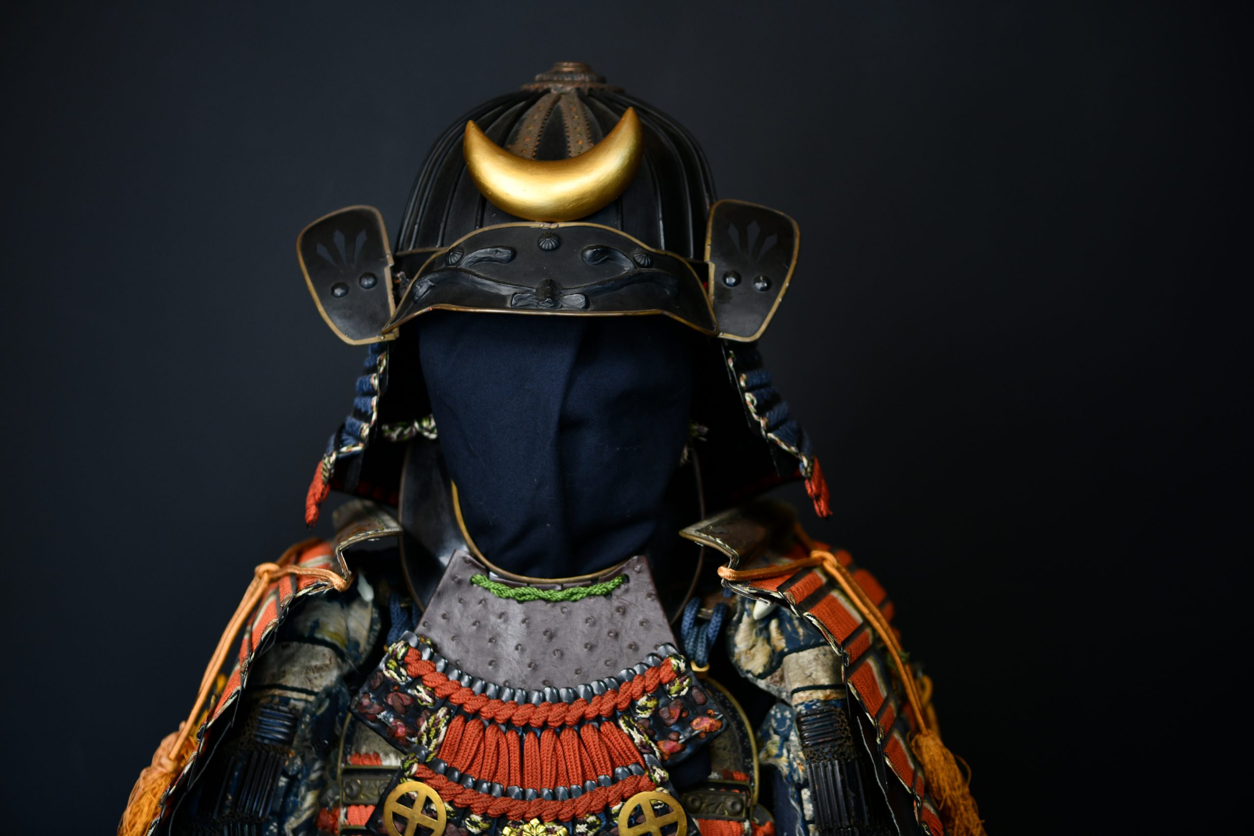 The throat is protected by a refined nodo-wa, decorated with red and black braiding and three family crests (mon): two round crosses and a golden leaf cluster.