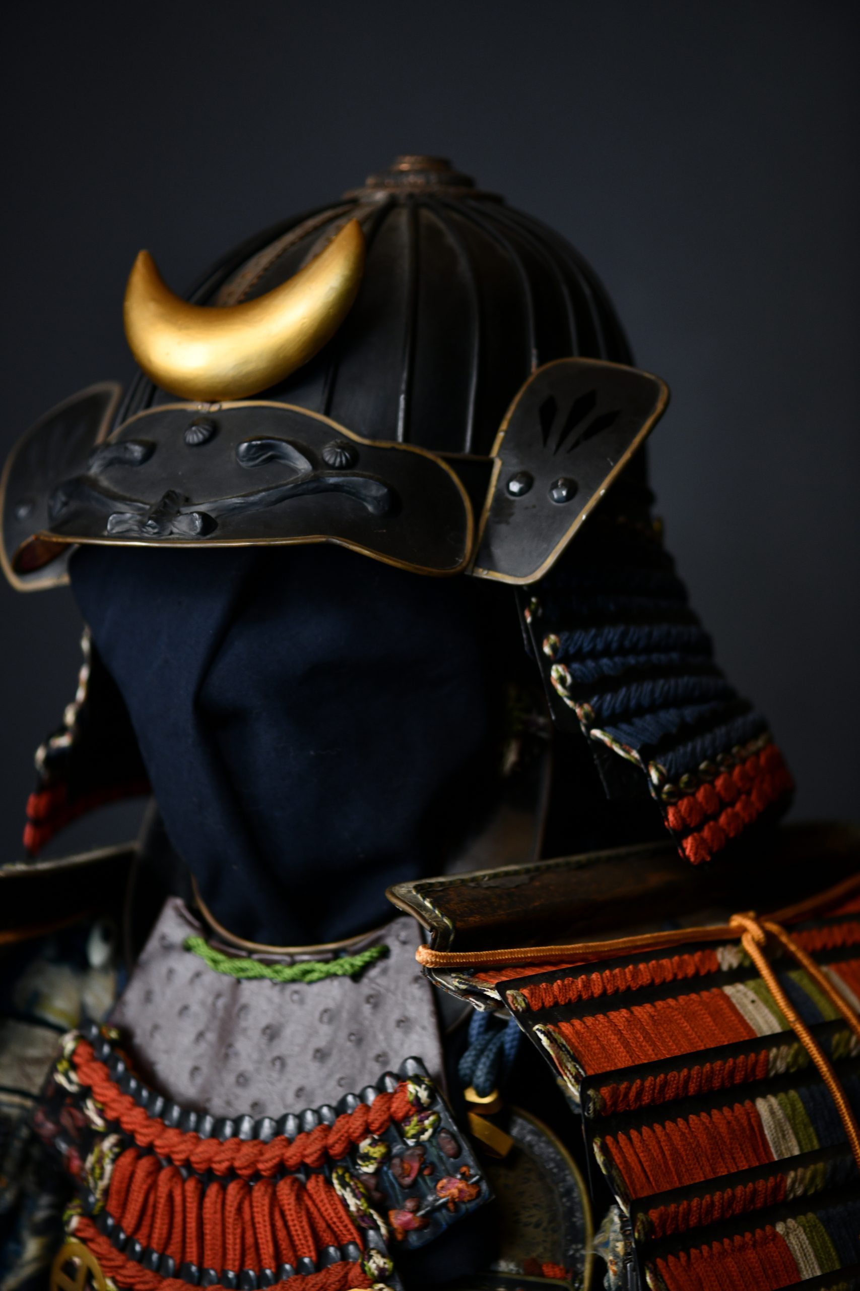 This set reflects the Late Edo and Meiji transition of samurai armor from battlefield utility to symbolic and ceremonial importance. The crescent moon maedate evokes mystical or divine association, while the vibrant cordage and heraldic crests indicate elite affiliation, likely for formal parade use or high-ranking officials.